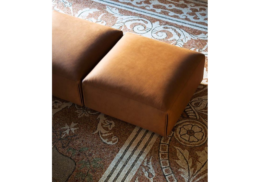 Le Mura von Mario Bellini für Tacchini entworfen, ist ein Pouf mit abnehmbarem Bezug, verfügbar in verschiedenen Stoffen und Ausführungen. Der Hocker ist Teil der Le Mura-Kollektion, einer Neuauflage des ursprünglichen Projekts von 1972, und kann mit dem Sessel und dem modularen Sofa kombiniert werden.