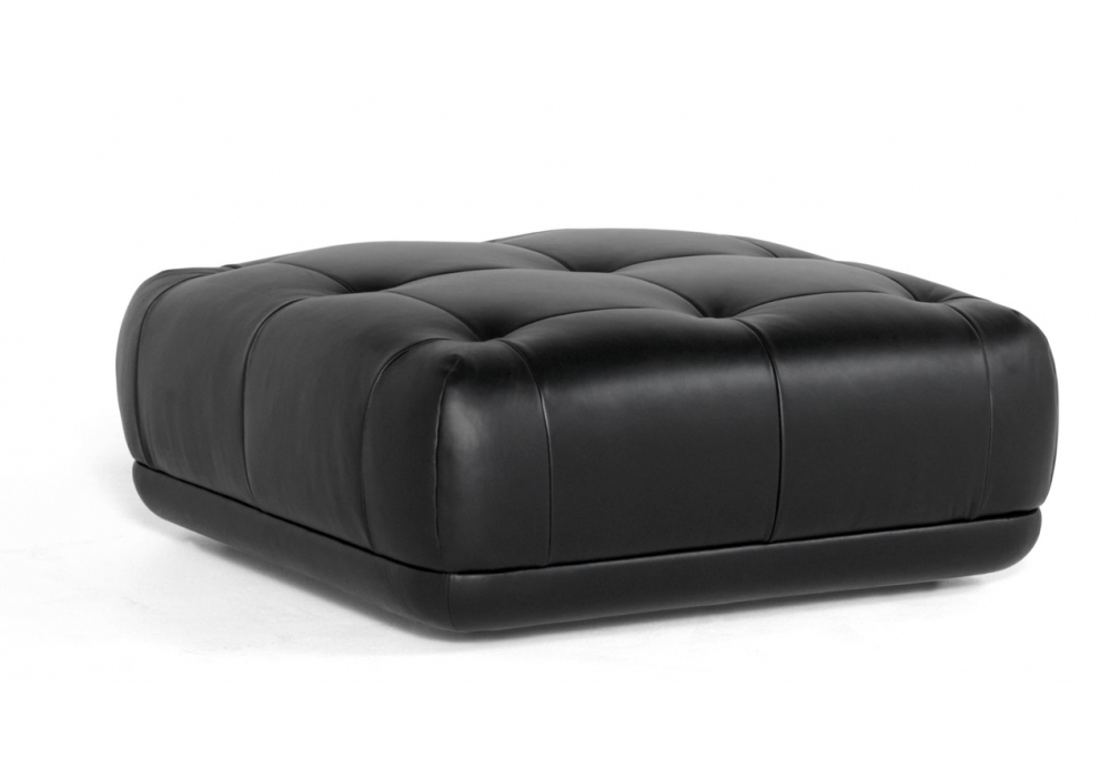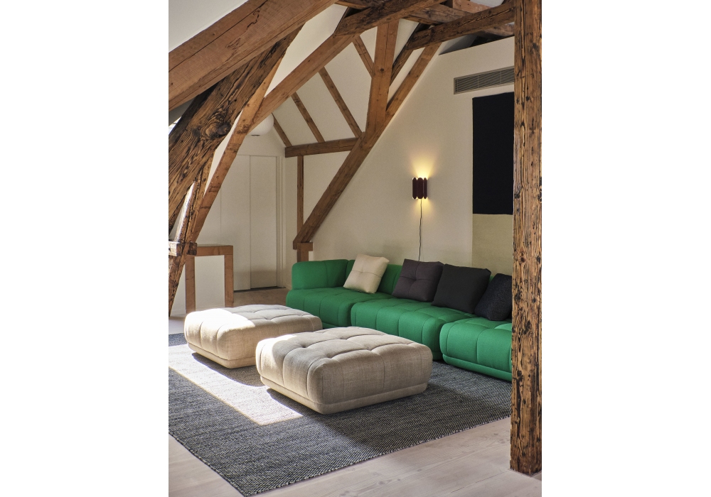 Quilton 05 von Doshi Levien für Hay entworfen, ist ein Sitzpouf mit Bezug aus Stoff oder Leder und Beinen aus schwarz gebeizter massiver Buche. Auch in der Version mit schwarzem Kontrastsockel erhältlich.