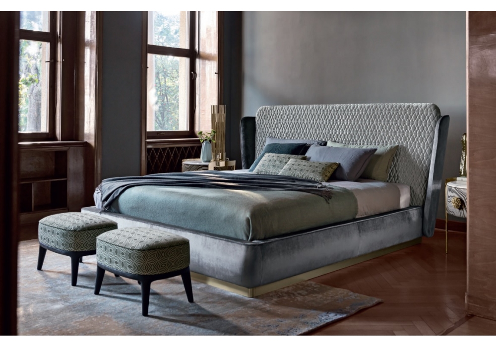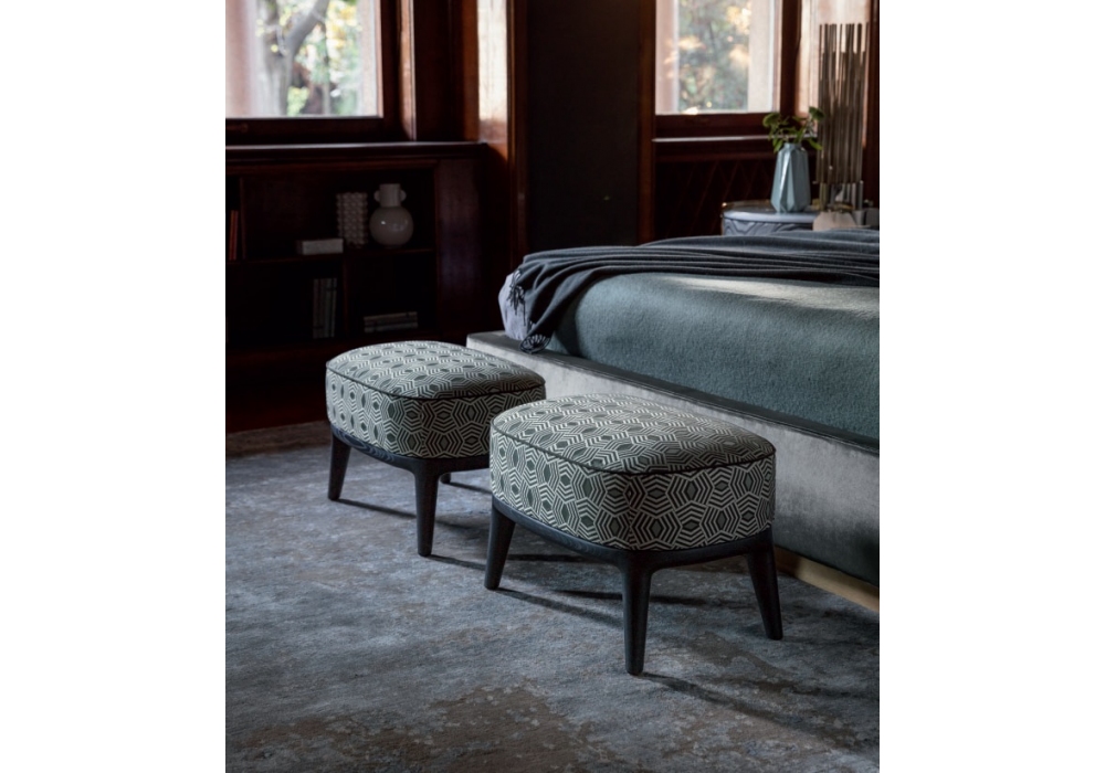 Freddy von Castello Lagravinese Studio für Opera Contemporary entworfen, ist ein Hocker mit Struktur aus Eschenholz, Polsterung aus Polyurethanschaum und Bezug aus Stoff oder Leder.