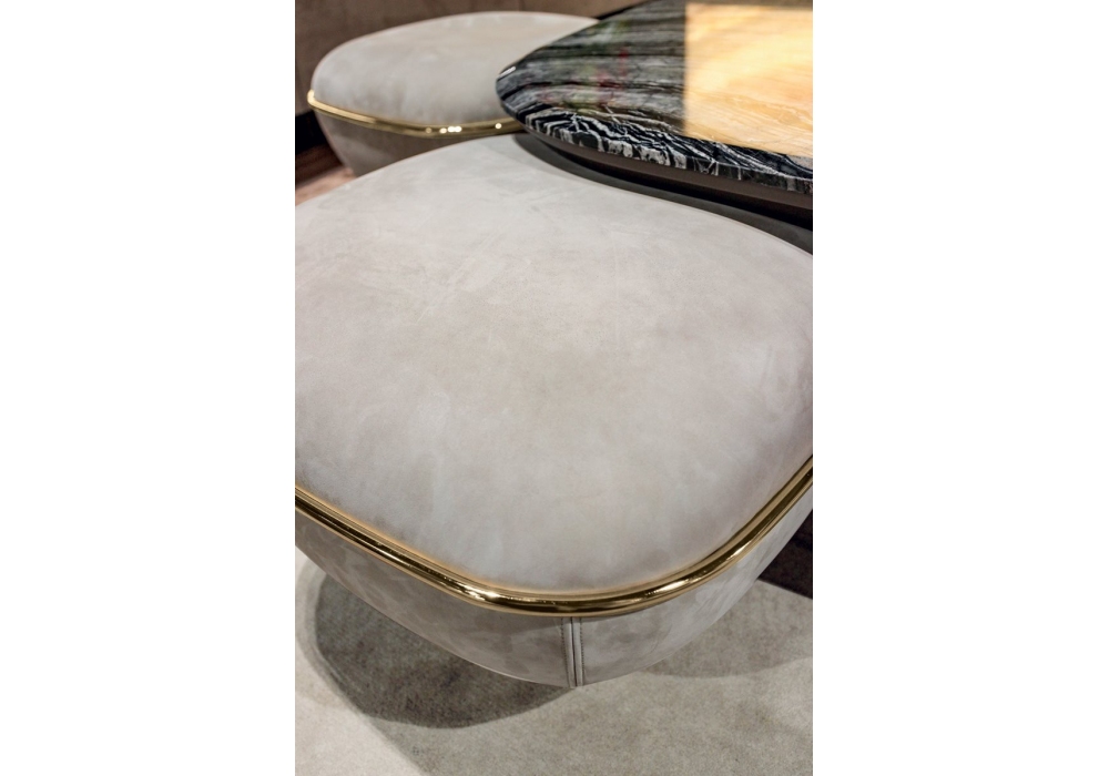 Sigma von Elle Studio für Longhi entworfen, ist ein Sitzpouff mit Holzstruktur, bezogen mit mitteldichtem Polyurethanschaum mit Ring aus glänzendem oder mattem Metall. Bezug aus nicht abnehmbarem Leder oder Stoff.