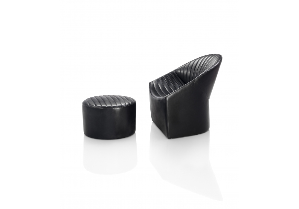Oyster von Jörg Boner für Wittmann entworfen, ist ein Pouf mit Holzstruktur, mit Bezug aus Stoff, Samt oder Leder. Erhältlich in verschiedenen Ausführungen.