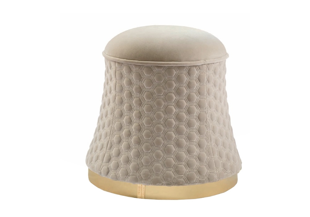Vogue von Andrea Bonini für Turri entworfen, ist ein Sitzpouff mit Struktur aus Sperrholz und Massivholz mit Polsterung aus Polyurethanschaum. Bezug aus nicht abnehmbarem Stoff oder Leder mit sechseckiger Stickerei auf der Struktur. An der Basis befindet sich ein Metallring in Gold-Finish.