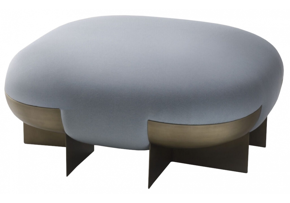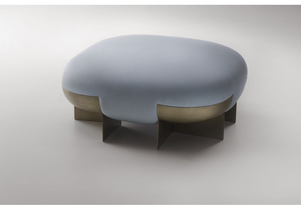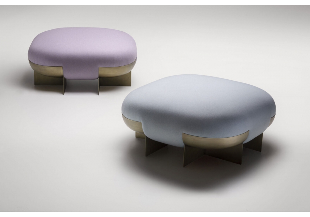 Ori von Stormo Studio für DeCastelli entworfen, ist ein Pouf mit einem Metallgestell in Messingausführung, Stoffbezug in verschiedenen Farben erhältlich.
