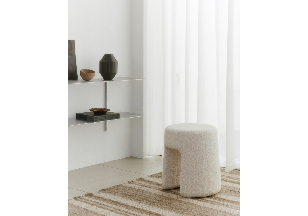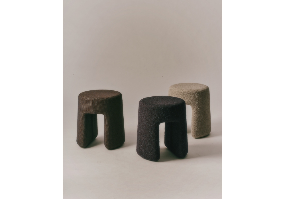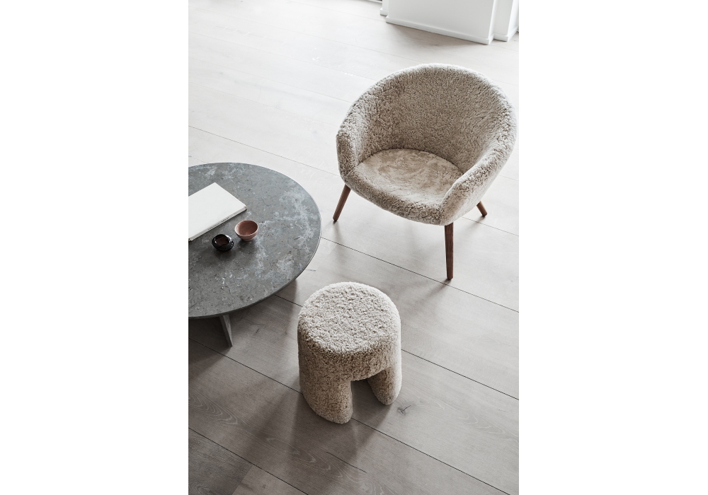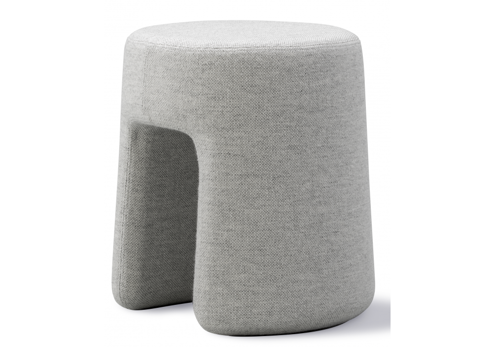 Sequoia, von Space Copenhagen für Fredericia entworfen, ist ein vollständig gepolsterter Sitzpuff mit einer Innenschale aus geformtem Polyurethanschaum, verstärkt durch eine Stahlstruktur und einen Holzsockel. Mit Stoff gepolstert.