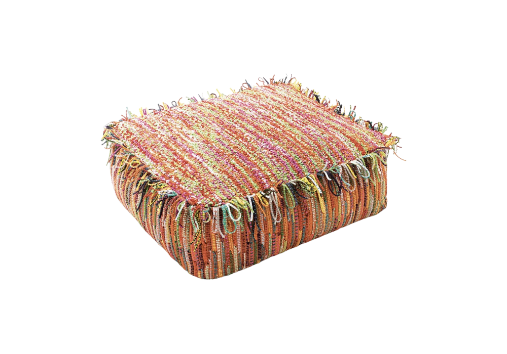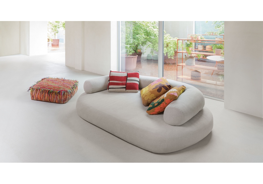 Zebrù, entworfen und hergestellt von CRS Paola Lenti, ist ein Pouf mit Stoffbezug, erhältlich mit oder ohne Fransen. Die Struktur ist mit Polypropylen-Mikrokügelchen gepolstert und mit einem festen Futter aus Polyestergewebe ausgestattet. Abnehmbarer Außenbezug aus handgewebtem Bouclé-Stoff. Mottainai-Kollektion 2023.