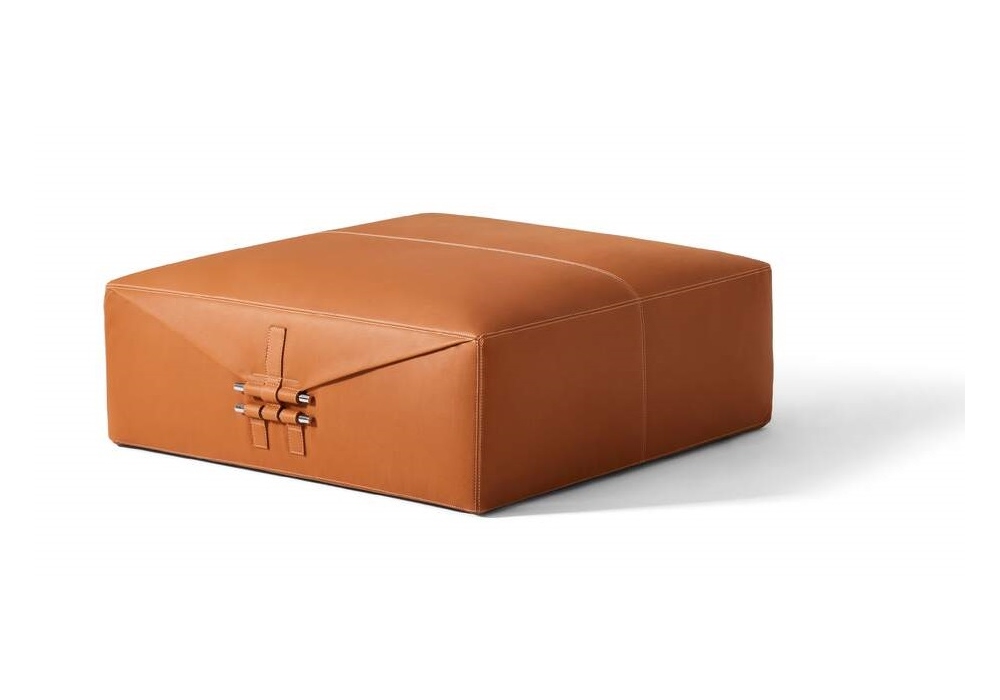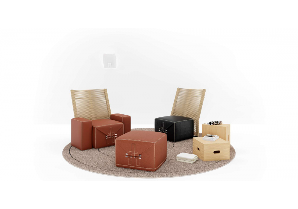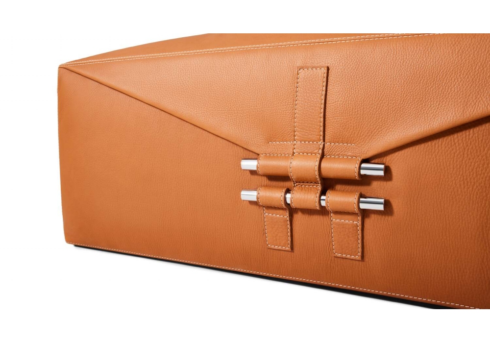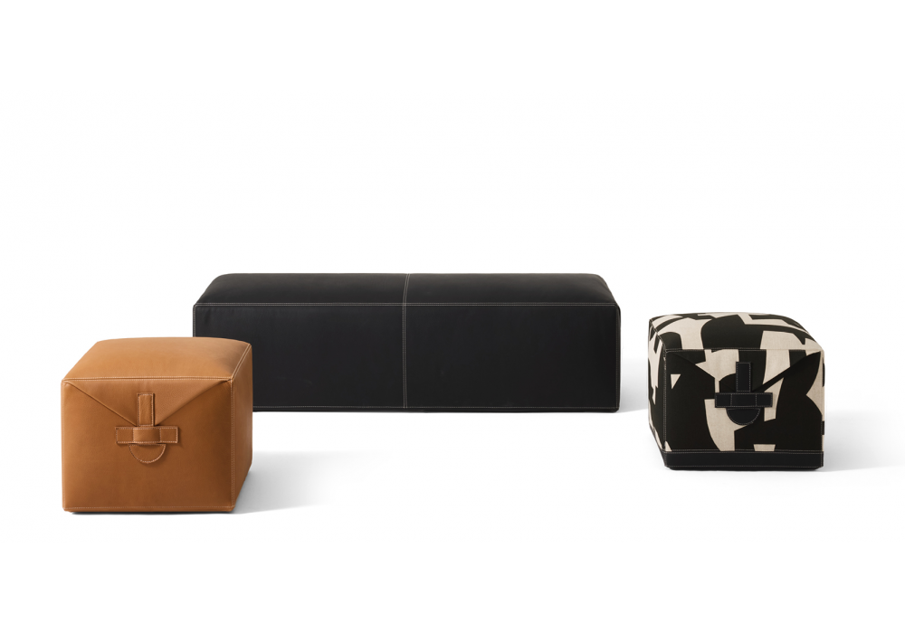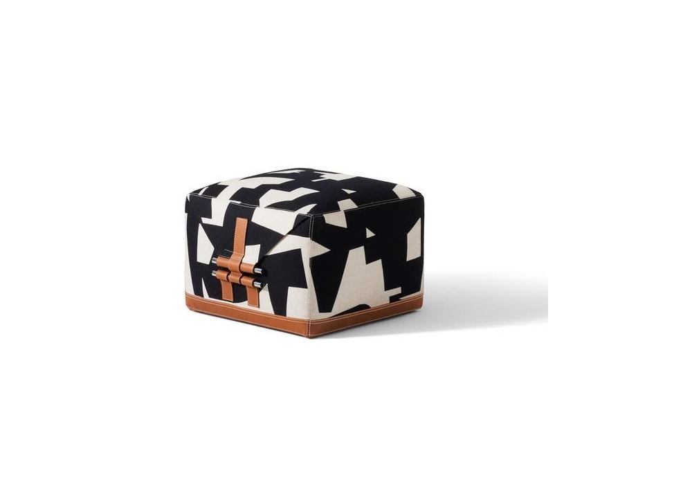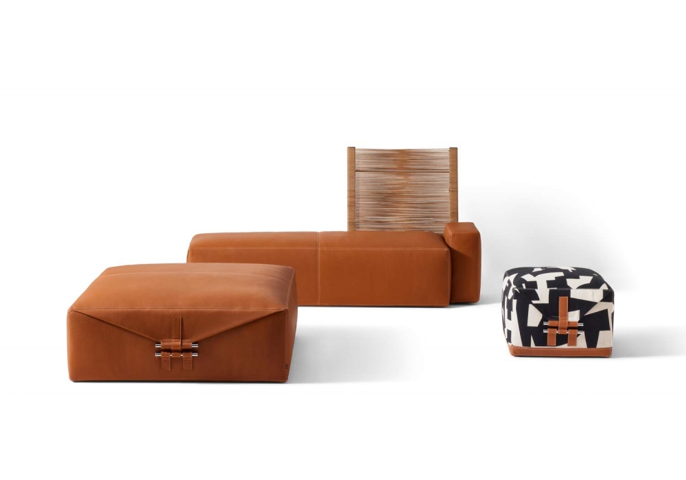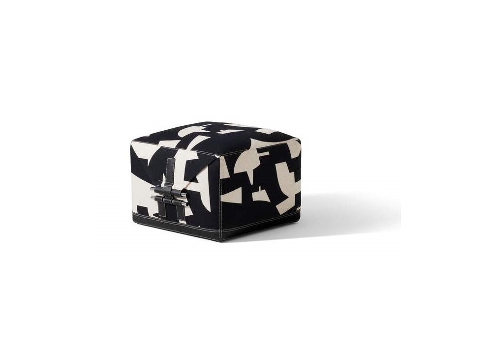 Somewhere El-S von Philippe Starck für Cassina entworfen, ist ein Sitzpuff mit Bogolan-Stoffbezug und Profil aus Leder oder Voyage-Leder. Details aus verchromtem oder glänzend bronzefarben lackiertem Metall. Verfügbar in mehreren Ausführungen und Abmessungen.