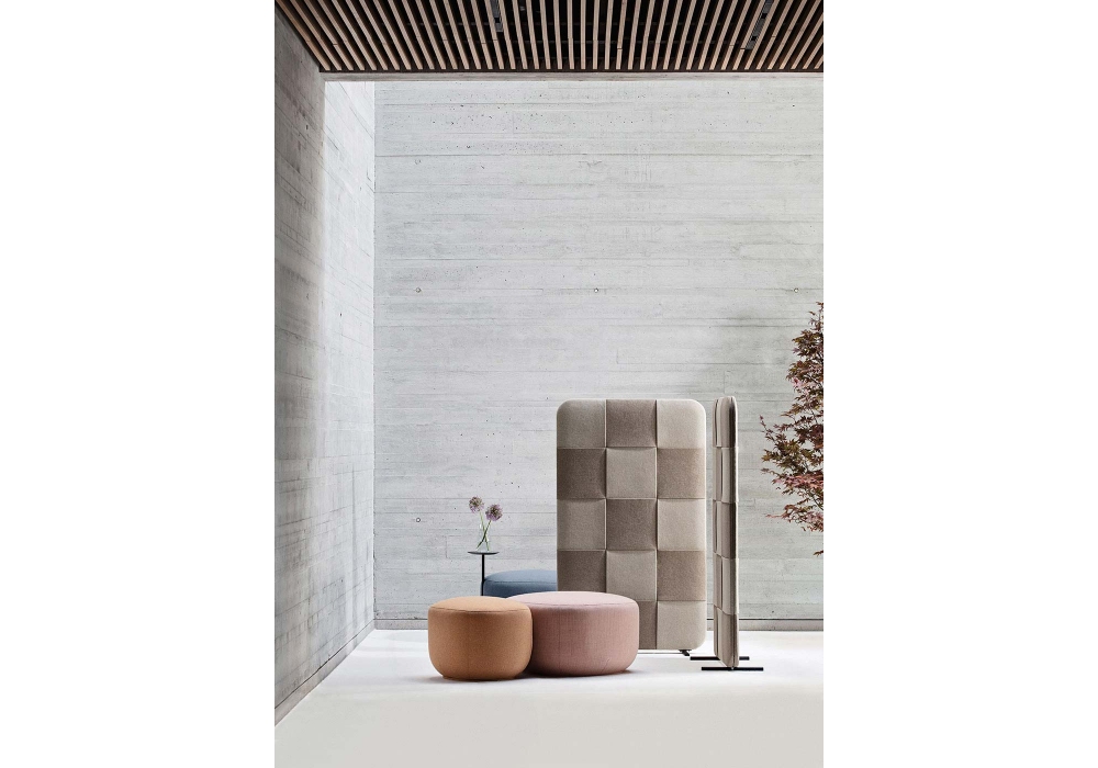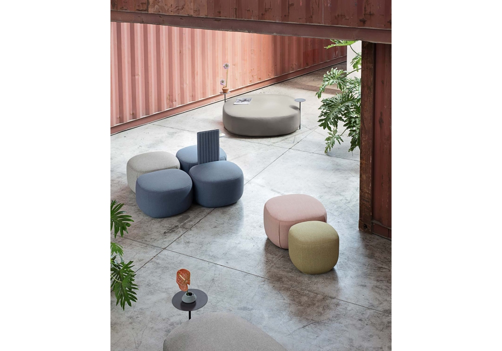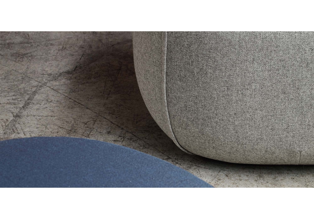 Bakku von Margherita Rui für Milani entworfen, ist ein Pouf mit Polsterung aus feuerfestem expandiertem Harz, Innenstruktur aus Sperrholz mit elastischen Riemen. Bezug aus Stoff oder Leder. Verfügbar in mehreren Abmessungen.
