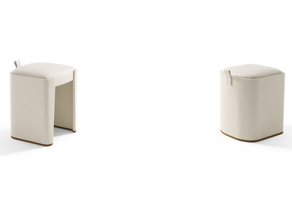 Venus is a stool designed by Roberto Lazzeroni for Giorgetti. tool with the structure in curved plywood and the seat in flexible multi-density polyurethane, covered with fibre. The feet are painted in a bronze colour with natural effect. The handle and the external upholstery are in leather, while the cushion can be in fabric or leather. The upholstery is not removable.
