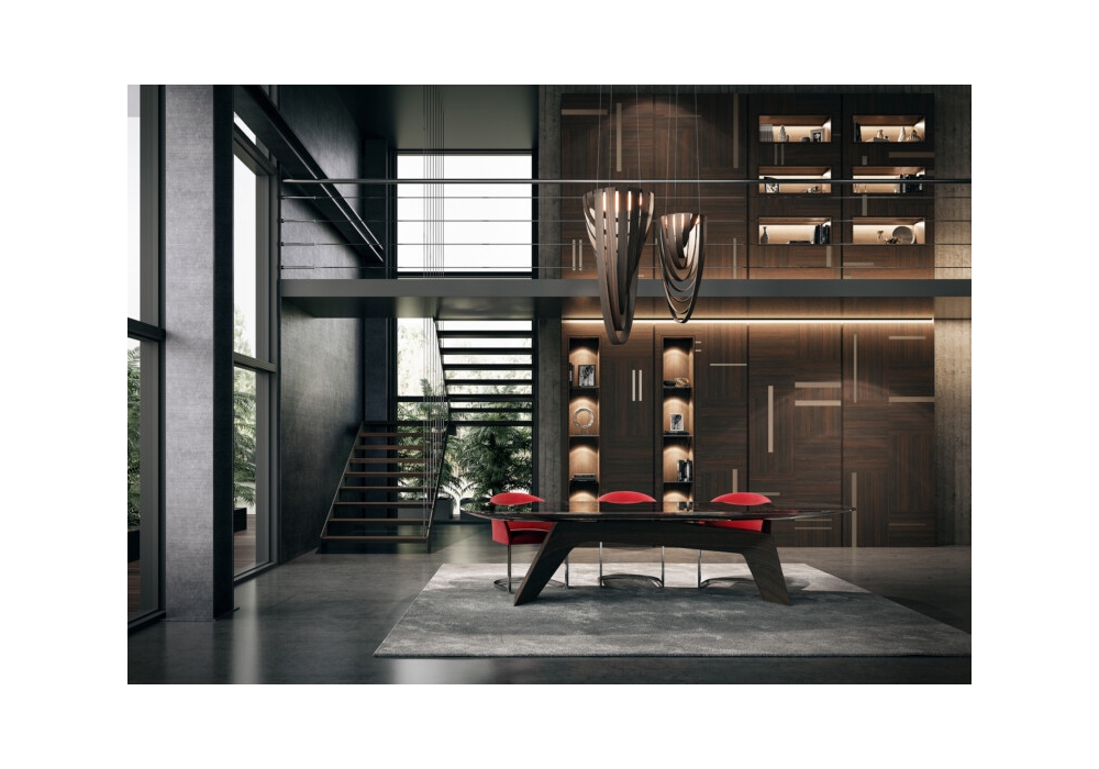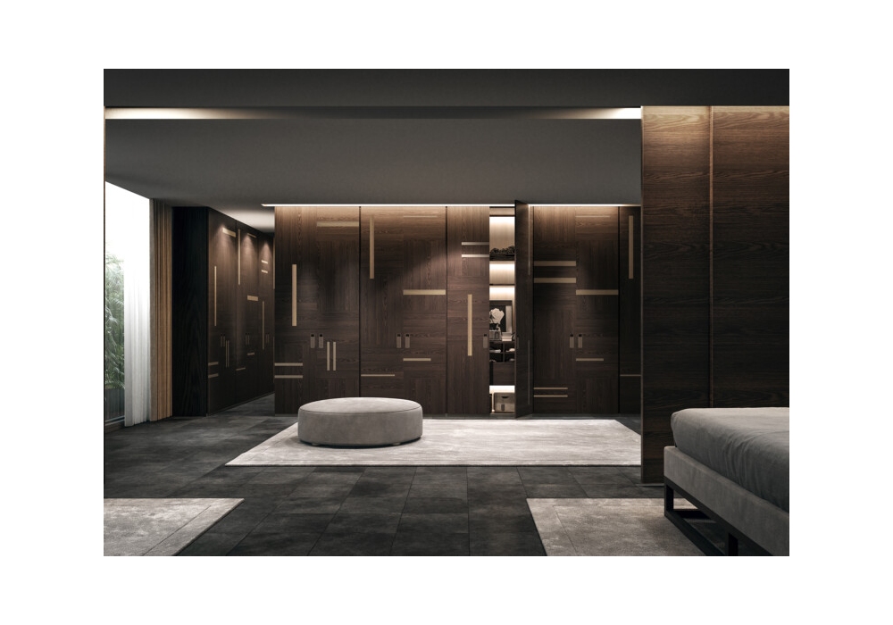 Agorà Boiserie, entworfen von Giuliano und Gabriele Cappelletti für Emmemobili, ist ein modulares System von Paneelen (55xH.270 cm) aus furniertem Sperrholz. Die Dekoration entsteht durch abwechselnde Maserung der Holzplatten mit der Möglichkeit, Messingeinsätze hinzuzufügen.