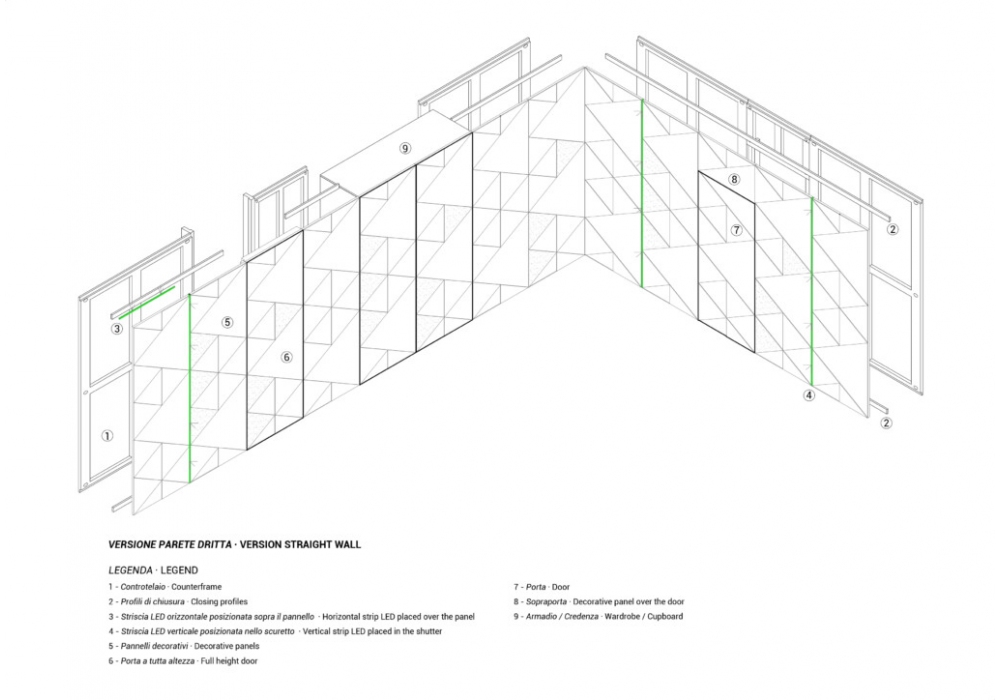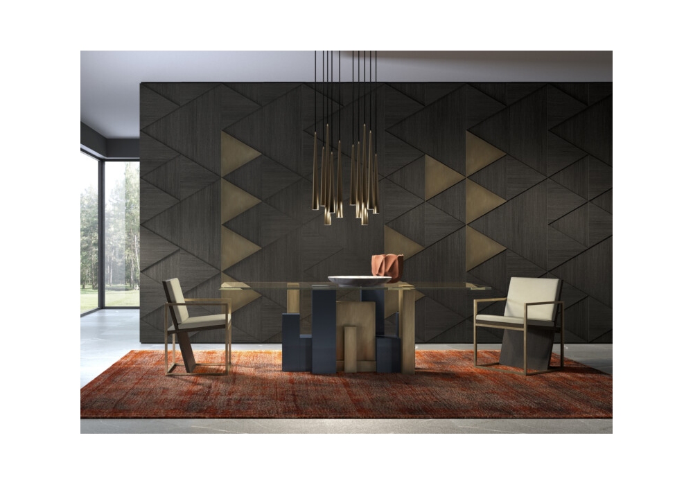 Arlequin Boiserie, entworfen von Ferruccio Laviani für Emmemobili, ist ein modulares Paneelsystem (90xH.260 cm) aus furnierten Paneelen, mit Holzdreiecken unterschiedlicher Größe und Dicke oder angereichert durch das Einfügen von Messingdreiecken.