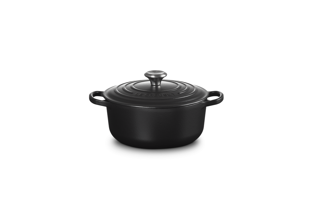 Cocotte Rotonda Evolution 20 von Le Creuset entworfen, ist ein runder Auflauf aus Gusseisen, der in verschiedenen Farben erhältlich ist. Weiße Innenausstattung mit Ausnahme des schwarzen Auflaufs mit schwarzer Innenausstattung.