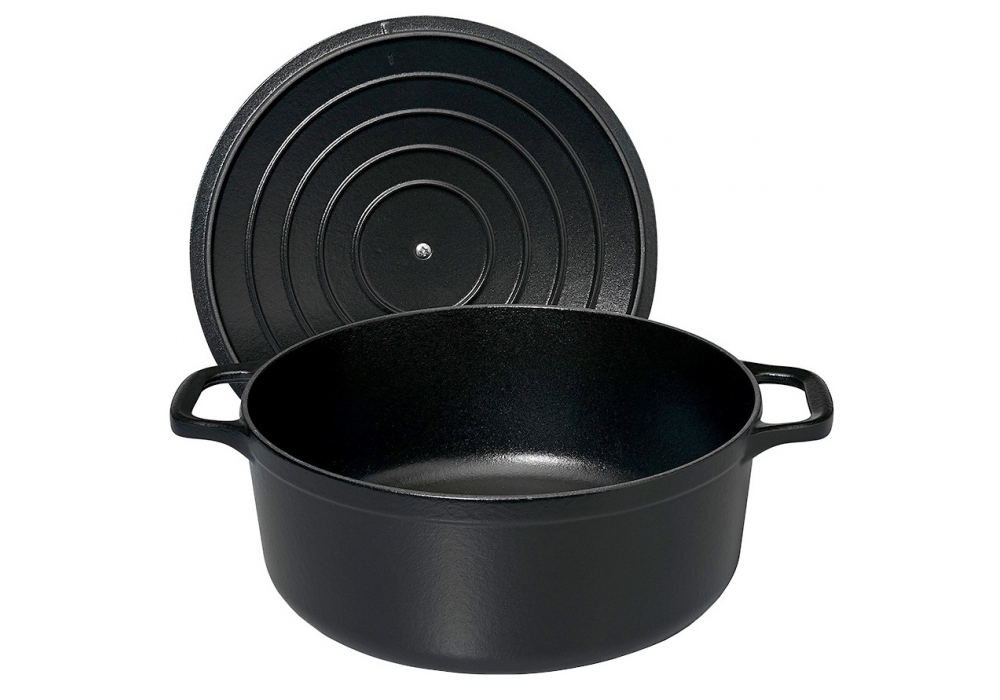 Cocotte Rotonda Evolution 26 von Le Creuset entworfen, ist ein runder Auflauf aus Gusseisen, der in verschiedenen Farben erhältlich ist. Weiße Innenausstattung mit Ausnahme des schwarzen Auflaufs mit schwarzer Innenausstattung.