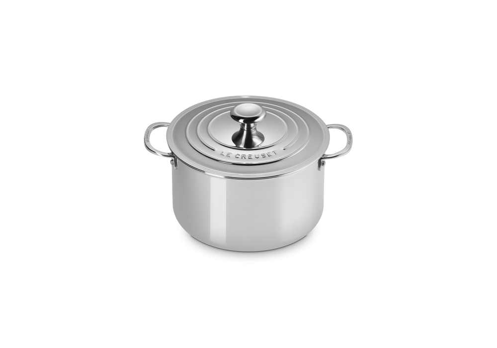 Pentola con Coperchio 24 von Le Creuset entworfen, ist ein Edelstahltopf mit Deckel.