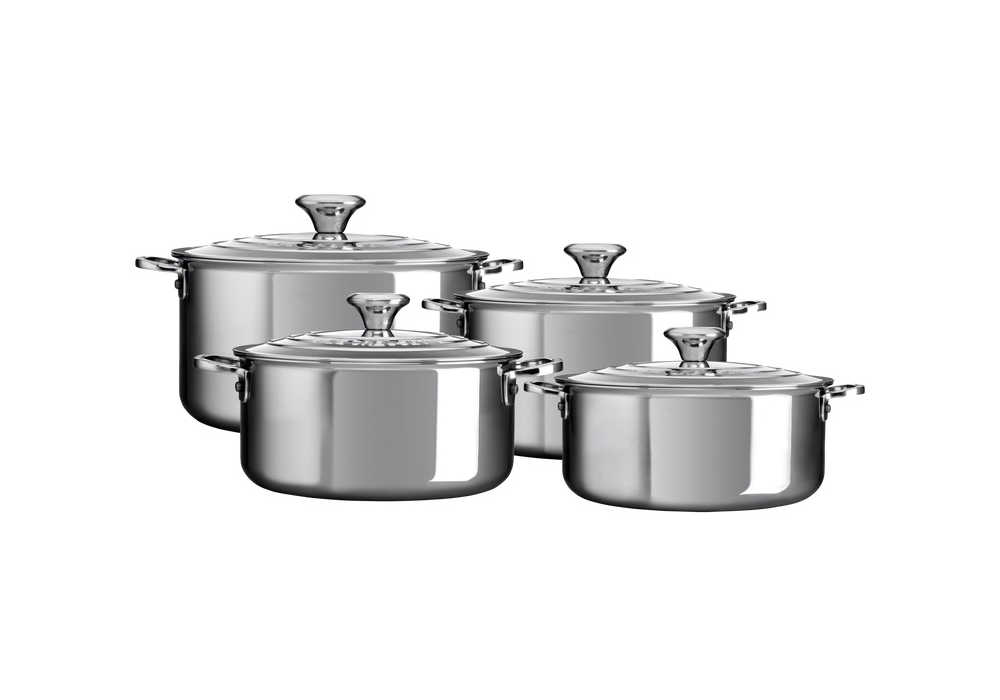 Batteria 4 Casseruole von Le Creuset entworfen, ist ein Satz von 4 Aufläufen aus Edelstahl, darunter 3 hohe und 1 niedrige.