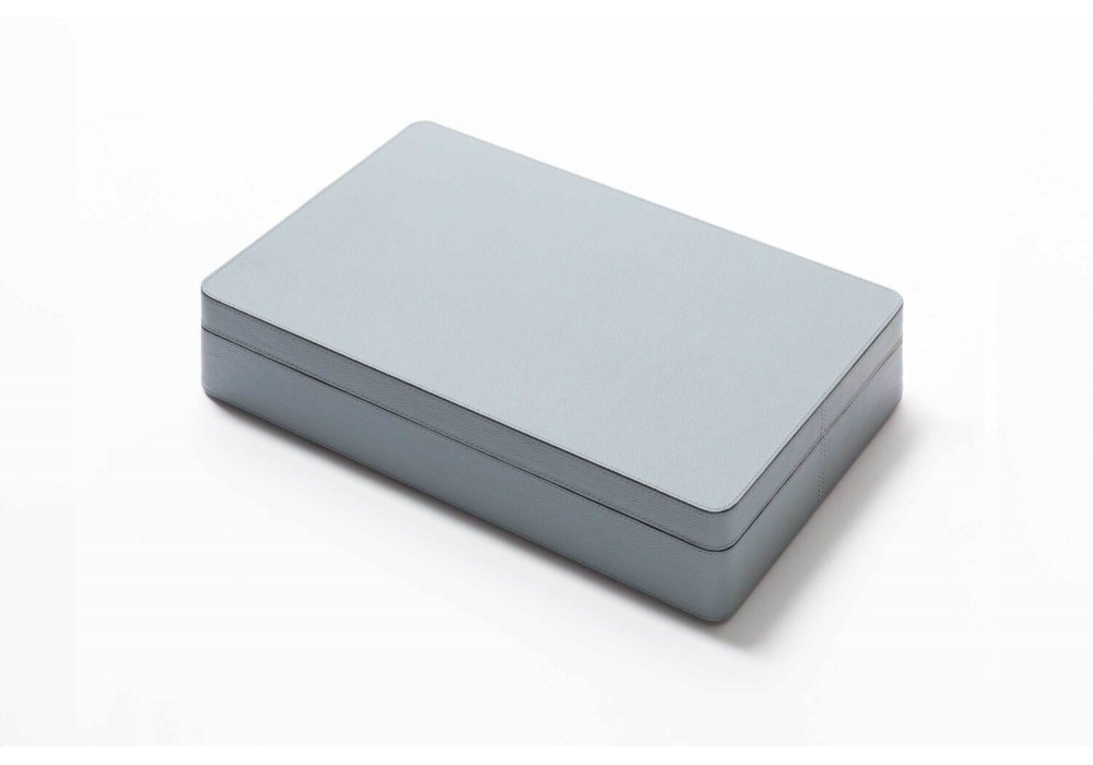 Mahjong, entworfen von Giobagnara x Poltrona Frau, befindet sich in einer kostbaren Holzkiste, die mit Pelle Frau®-Leder bezogen ist. Im Inneren befinden sich 148 Walnussholzplättchen, 244 Walnussholzstäbe, 4 standardmäßige undurchsichtige Plexiglaswürfel, 1 undurchsichtiger Plexiglaswürfel (mit den Initialen des Himmelsrichtungen auf seinen Seiten), 4 Tabletts für die Spielsteine und 1 Tablett für die Würfel und Stäbchen.