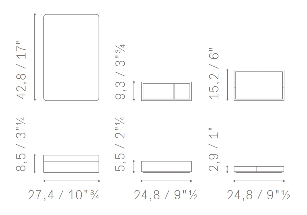 | Abmessungen | 42,8 x 27,4 x H 8,5 cm - 9,3 x 24,8 x H 5,5 cm - 15,2 x 24,8 x H 2,9 cm |