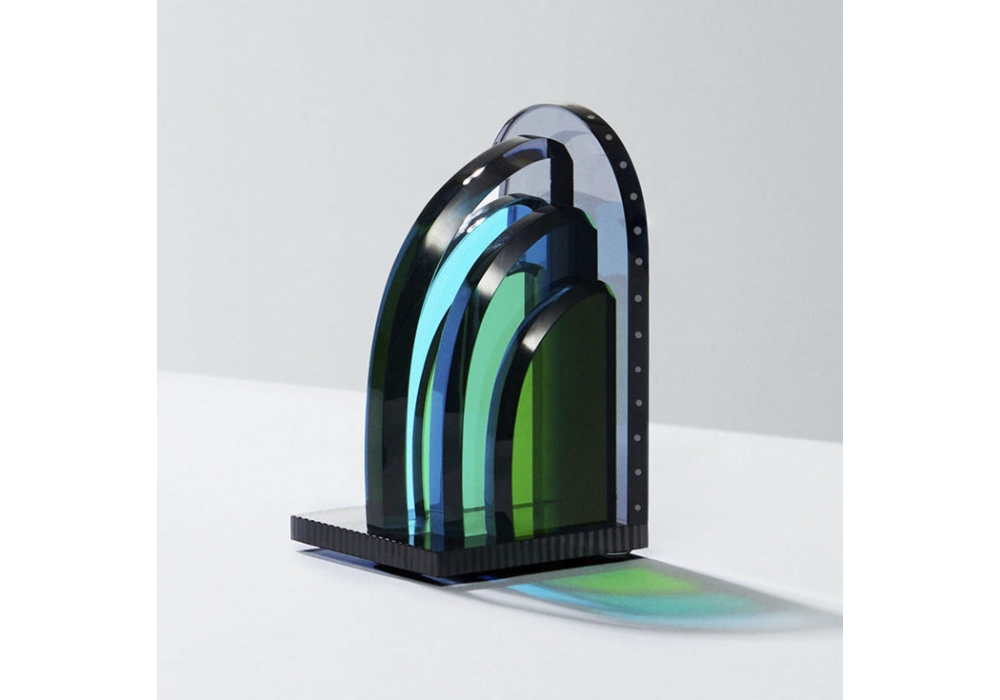 Tribeca, hergestellt und entworfen von Reflections Copenhagen, ist eine abgerundete Buchstütze, die durch mehrere Kristallelemente in Grün, Blau und Schwarz strukturiert ist.