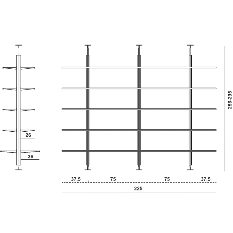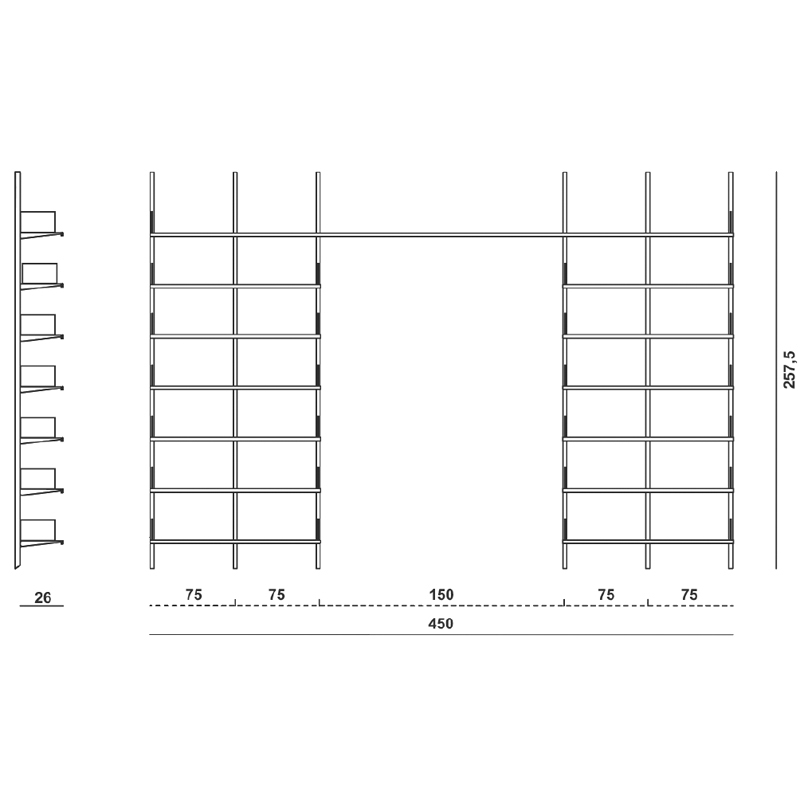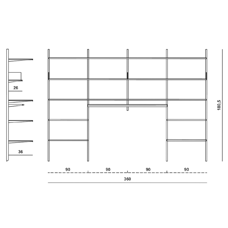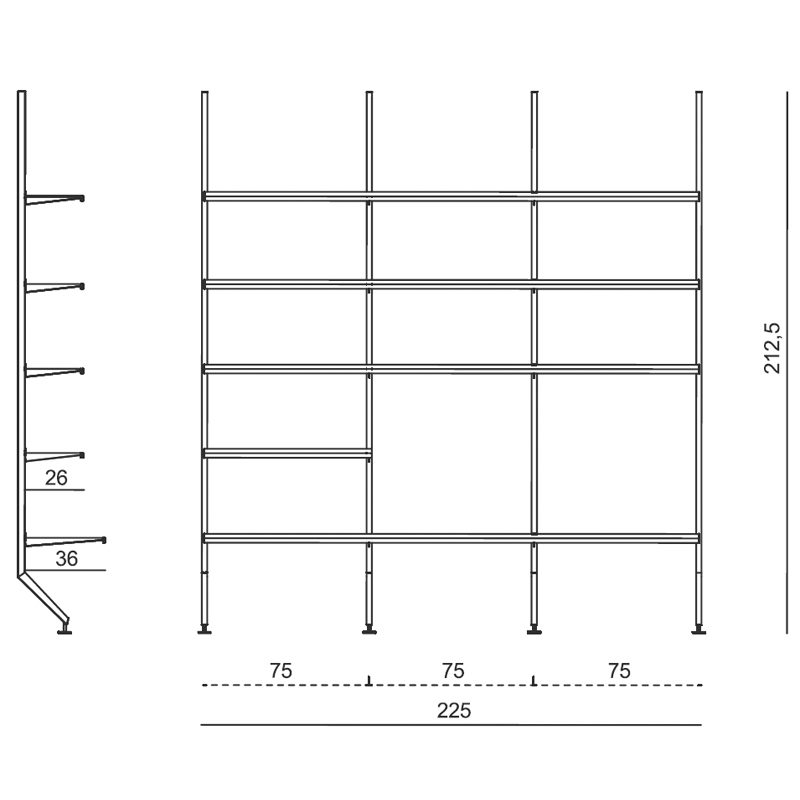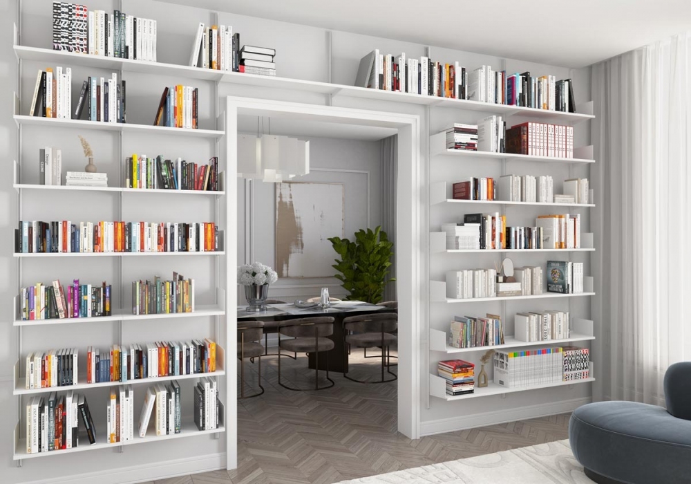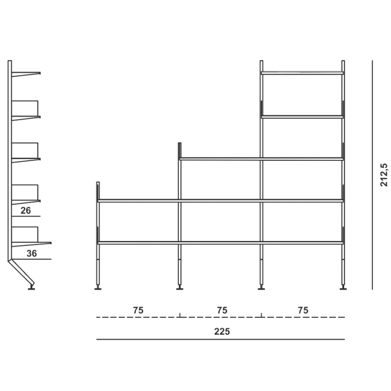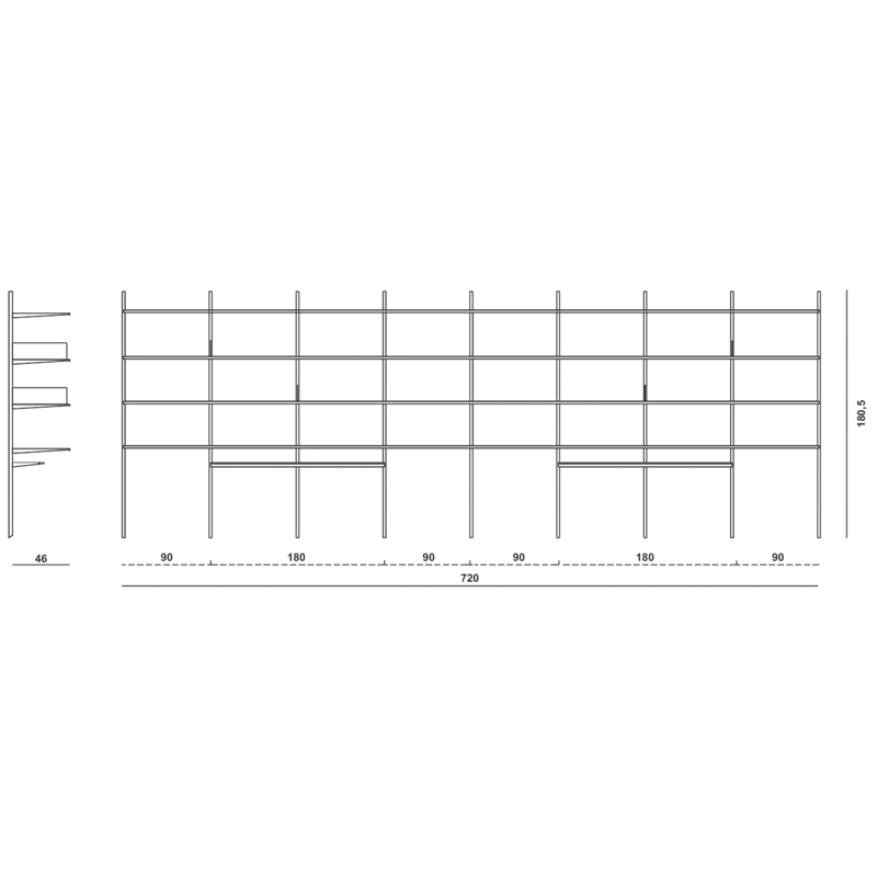 Continua, von Hannes Wettstein für Pallucco entworfen, ist ein modulares Bücherregal/eine ausgestattete Wand mit Aluminiumregalen und Tragstruktur und Füßen aus lackiertem Stahl.