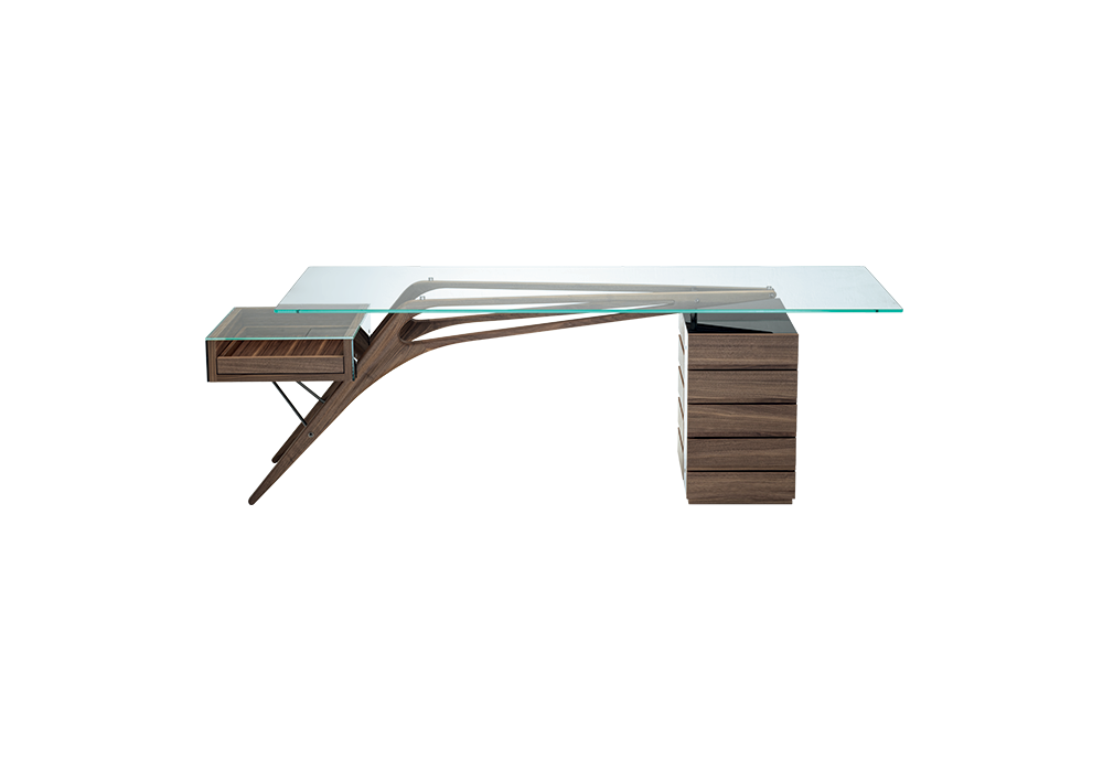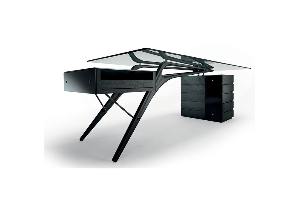 2690 Cavour von Carlo Mollino für Zanotta entworfen, ist ein Schreibtisch mit Glasplatte. Struktur, Kommode und ausziehbare Platte in Eiche natur, schwarz gebeizt oder Nussbaum Canaletto. Es ist ein Executive-Kit erhältlich, das den Bezug aus schwarzem Leder 95 für den unteren Teil des Auszugs und die erste Schublade der Kommode, eine Schreibtischunterlage aus schwarzem Leder 95 cm 80x50 und einen Stifthalter aus Massivholz umfasst in den gleichen Ausführungen wie der Schreibtisch.