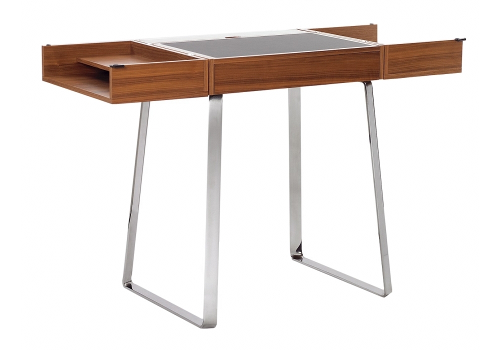 Zelos von Christoph Böninger für ClassiCon entworfen, ist ein schöner Aufklappbarer Sekretär mit seitlichen Fächern und einer Schublade. Zusätzlicher Stauraum mit Kabeldurchlass. Schreibtischunterlage aus Kernleder. Korpus hochglanzlackiert oder mit Echtholz furniert. Gestell aus verchromtem Flachstahl. In verschiedenen Ausführungen erhältlich.