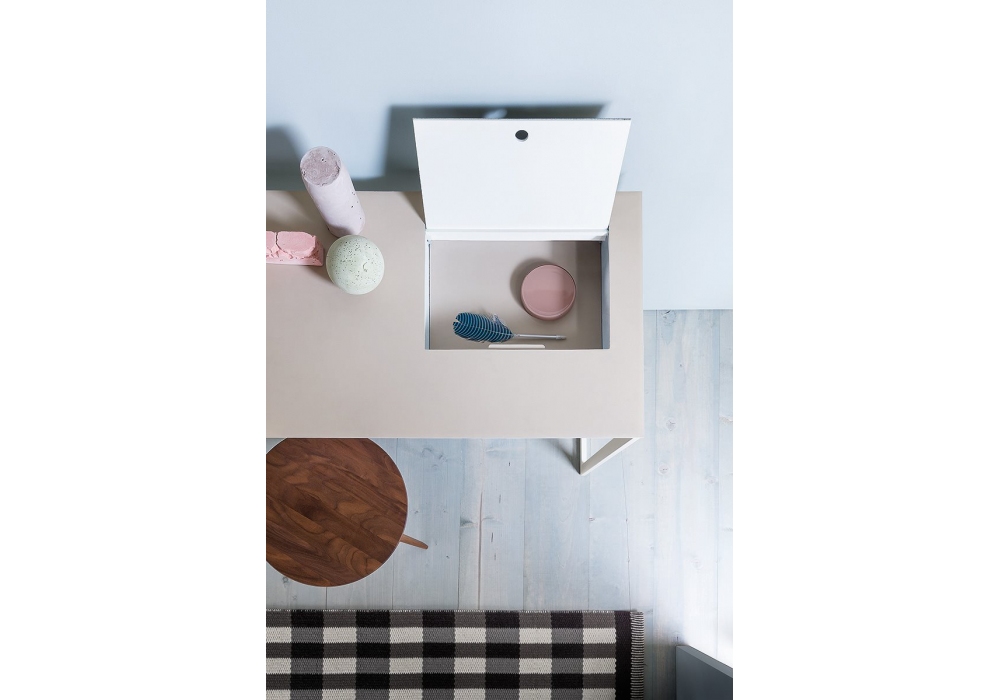 2730 Calamo von Gabriele Rosa für Zanotta entworfen, ist ein Schreibtisch mit Struktur und Tischplatte aus weiß, schwarz oder graphit lackiertem Stahl. Oberteil und Ablagefach aus pigmentiertem Leder 90. Das Fach ist durch eine Klappenöffnung zugänglich.