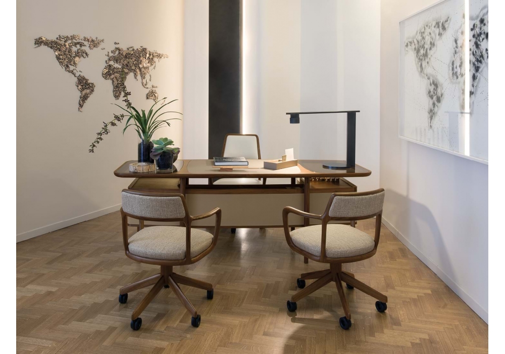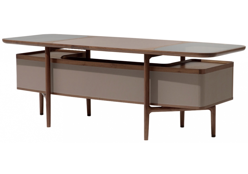 Mogul, von Roberto Lazzeroni für Giorgetti entworfen, ist einer mit dem rahmen aus massivem walnuss canaletto holz und furnier. Die Oberseite ist mit dem zentralen Einsatz immer in Leder und den seitlichen in Leder oder in gehärtetem Kristallglas erhältlich. Es ist möglich, unter die Oberseite, rechts oder links einzufügen, eine Mehrfachsteckdose für 1 Schuko-Steckdose, 1 RJ45-Buchse und 1 Hochgeschwindigkeits-USB-Buchse.