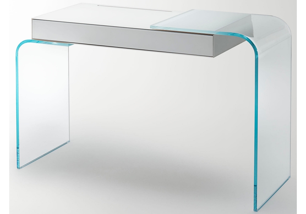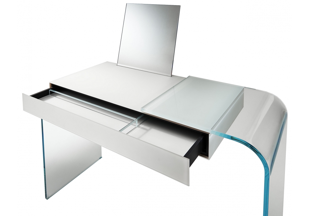 Strata, von Yabu Pushelberg für Glas Italia entworfen, ist ein Schreibtisch mit gebogenen Beinen aus extraklarem Glas. Die Platte ist mit glänzend oder matt lackiertem Hartglas verkleidet und verfügt über eine Push-Pull-Schublade. Die Platte verfügt über eine Kabelführungsnut, in die ein doppelseitiger Spiegel eingesetzt werden kann.