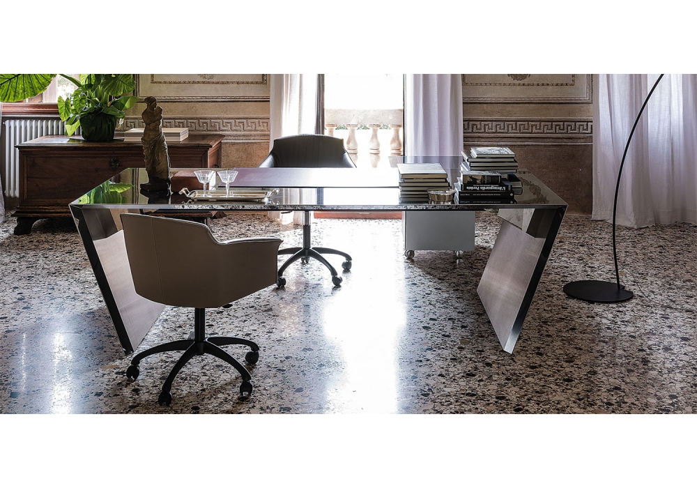 Vega, von Giorgio Cattelan für Cattelan Italia entworfen, ist einer Schreibtisch mit Daktylus, aus Edelstahl oder in Canaletto Nussbaum oder gebranntem Eichenholz. Schubladenelement auf Rollen mit zwei Schubladen, Korpus lackiert silber oder graphite und Fronten aus Kernleder laut Musterkarte, PAD aus Kernleder laut Musterkarte. Kleine Unregelmäßigkeiten der Reflexion auf der Edelstahl Basis sind nicht zu vermeiden, da das Teil per Hand hergestellt wird. Verfügbar in zwei Abmessungen.