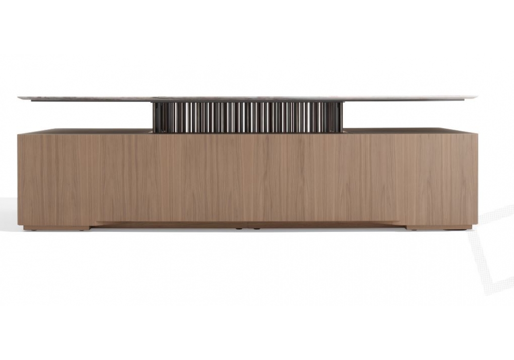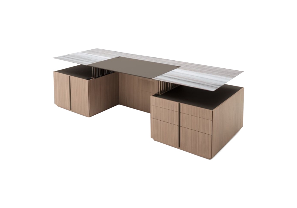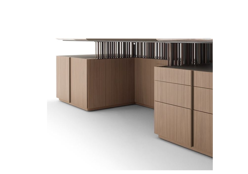G-Code von Dante O. Benini und Luca Gonzo für Giorgetti entworfen, ist ein Chefschreibtisch mit Struktur aus Nussbaum Canaletto, in verschiedenen Ausführungen. Die Platte ist in Marmor oder Canaletto-Holz erhältlich, eine Ledereinlage ist immer vorhanden, um das für die Struktur gewählte Finish zu begleiten. Die Platte wird von 158 Metallzylindern in verschiedenen Größen und Ausführungen getragen. Der Schreibtisch ist mit Beleuchtungs- und Elektrifizierungssystemen und optional mit Secure Lock für die Schubladen (automatisches Schließsystem, das über eine App verwaltet wird) ausgestattet.