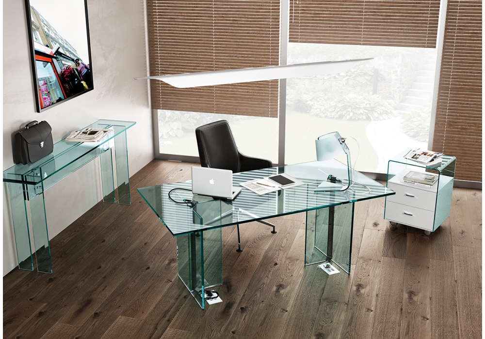 LLT Ofx Executive von Dante O. Benini und Luca Gonzo für Fiam entworfen, ist ein Schreibtisch aus transparentem Glas. Die Oberseite wird auf geklebte Glasböden aufgesetzt und die vorhandenen Löcher dienen als Kabelverschraubungen.