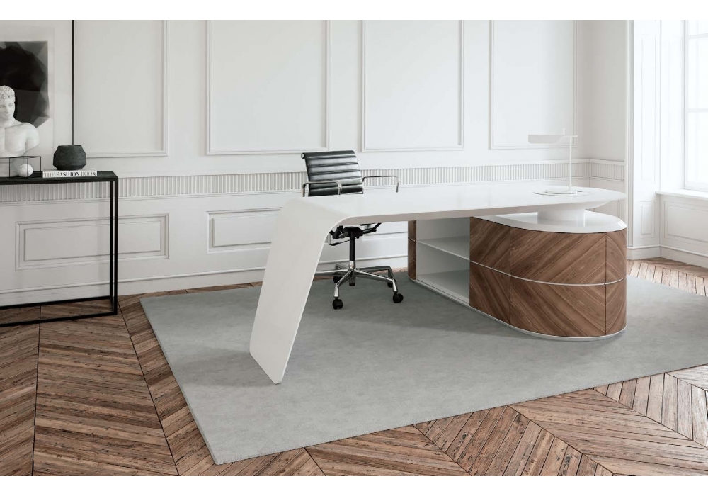 Kaniv von Christophe de Sousa für Gual Design entworfen, ist ein Schreibtisch mit Platte aus matt lackiertem MDF und Struktur aus furniertem oder glänzend lackiertem Holz. Ausgestattet mit einem Drehdach, 2 Containertüren passend zur Struktur und 1 Innenregal. Oberseite mit Platz für Kabeldurchführung. Verfügbar in verschiedenen Ausführungen und Abmessungen.
