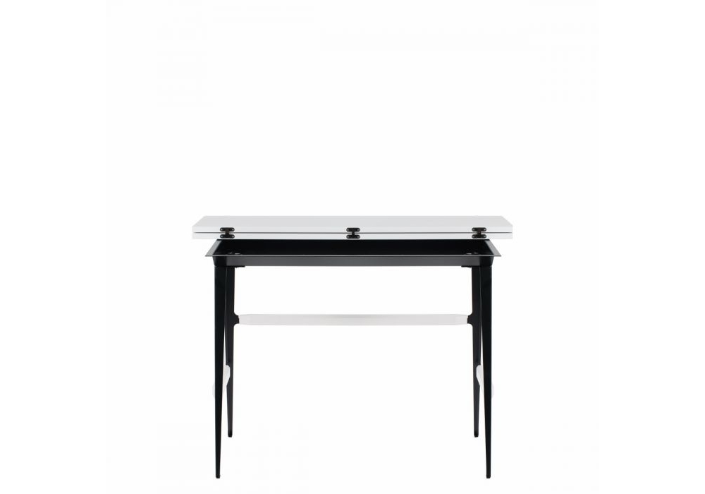 Portable Atelier, von Philippe Nigro für Driade entworfen, ist ein Schreibtisch mit Platte aus matt lackierter Spanplatte. Ein Teil der Oberseite kann zur „Klappe“ geöffnet werden, um Zugang zu einem Sicherheits-„Bad“ zu erhalten, das mit Schlitzen für den Durchgang von Steckdosen und PC-Anschlusskabeln ausgestattet ist. Querstreben, die die Beine verbinden, aus schwarz lackierter Buche, passend zur Tischplatte.