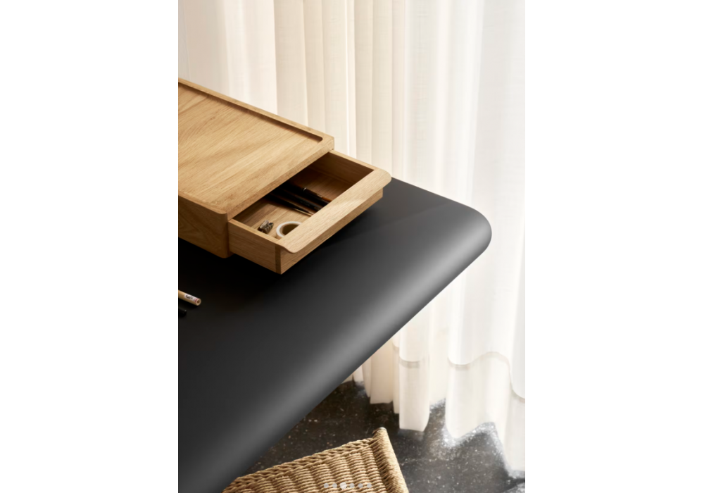 AB019 von Anker Bak für Carl Hansen & Søn ist ein Wandschreibtisch mit furniertem Eichenholzgestell und schwarzer oder passender Laminatplatte. Erhältlich mit einer Schublade aus Massivholz in der gleichen Ausführung wie das Holzgestell; Stützen aus Edelstahl.