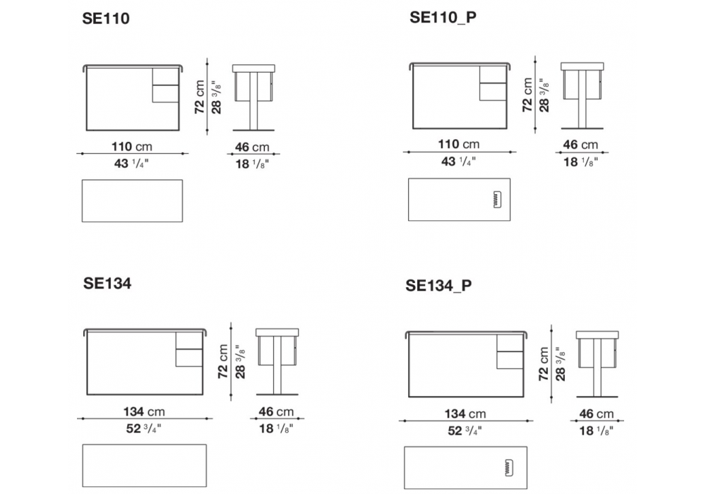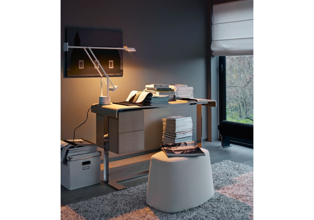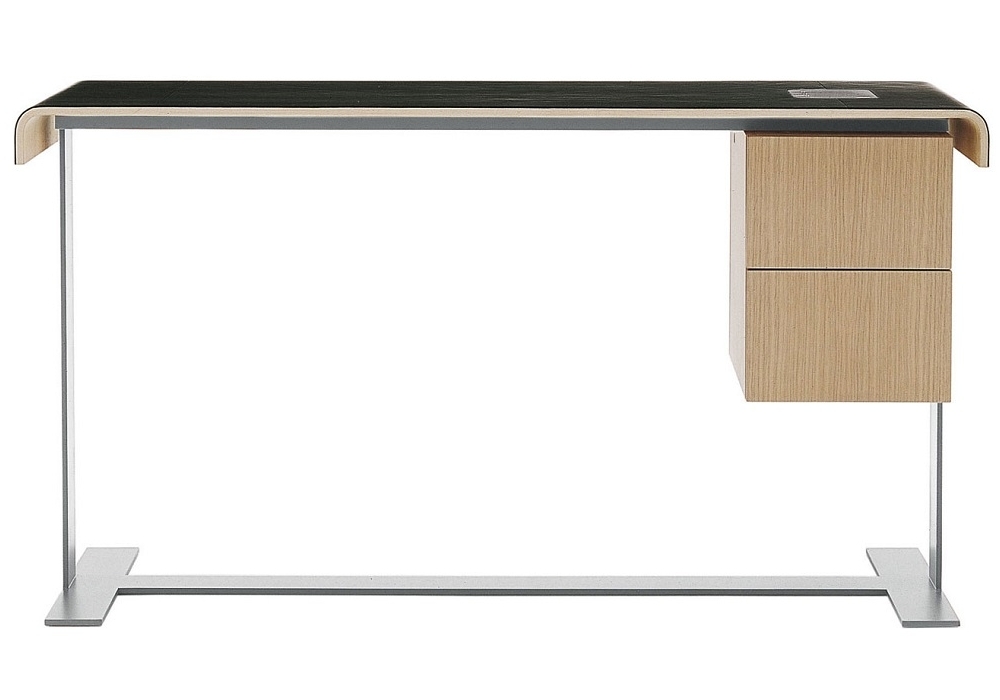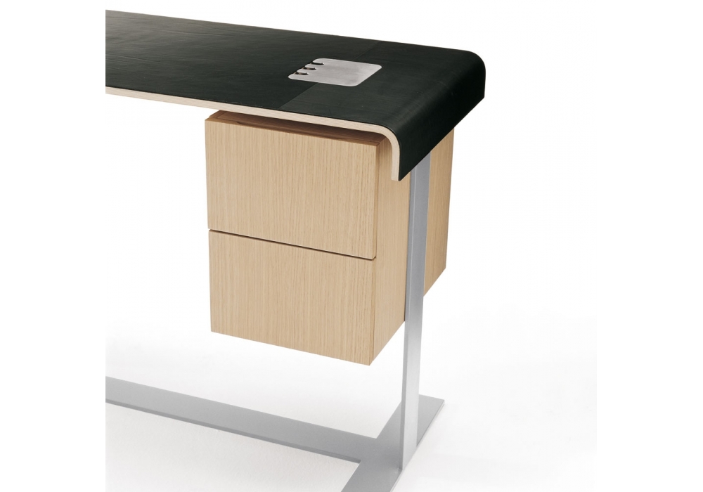 Eileen, von Antonio Citterio für B&B Italia entworfen , ist ein Schreibtisch mit einer Platte aus mehrschichtigem Holz mit einer Abdeckung aus Kernleder. Rahmen aus zinnbemaltem, schwarz verchromtem oder hell verchromtem Stahl. Schublade aus furniertem Massivholz: graue Eiche, gebürstete helle Eiche oder gebürstete schwarze Eiche.