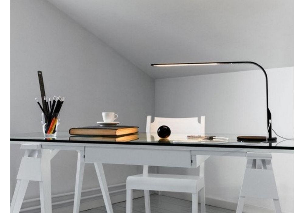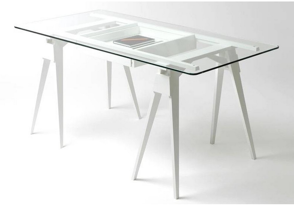 Arco by Design House Stockholm is a desk. Put your stationery on display. American Chuck Mack has created a desk supported on trestles; a toughened-glass worktop which makes the contents of your drawers visible to everyone’s admiration (or dismay, depending on how orderly you are).