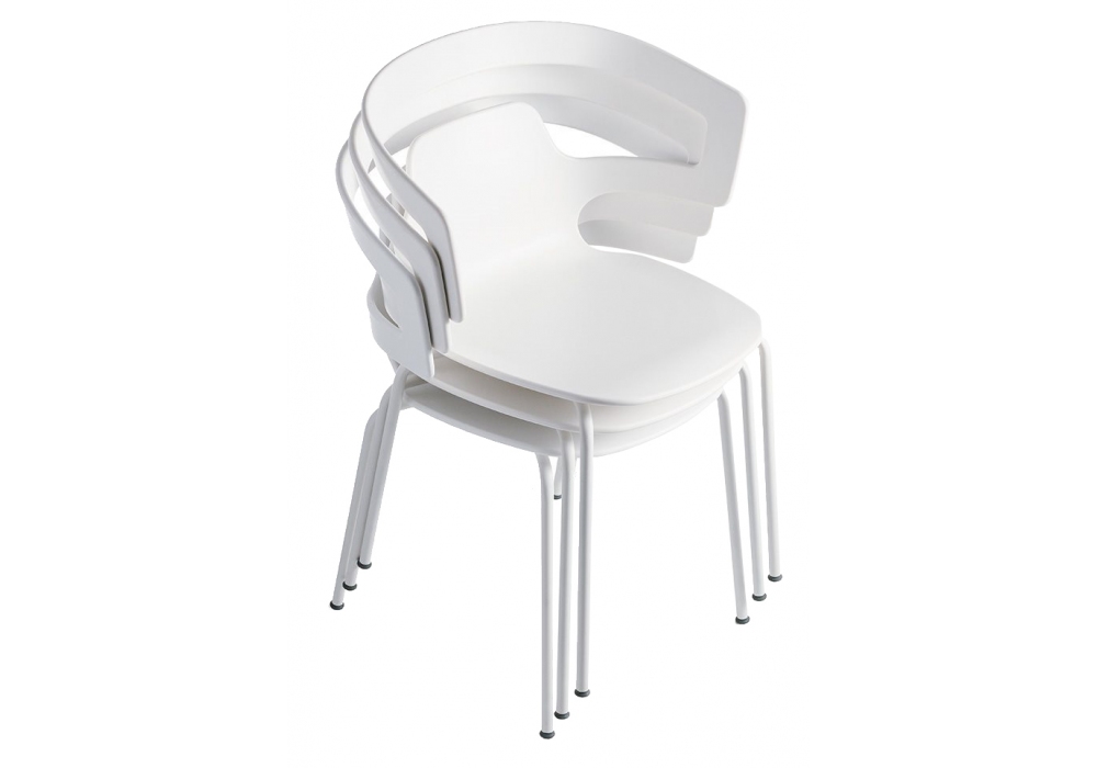 Der von Alfredo Häberli für Alias entworfene Segesta 500 ist ein stapelbarer Stuhl mit Armlehnen, einer Schale aus weißem Kunststoff und einer Basis aus lackiertem Stahl, die in verschiedenen Ausführungen erhältlich ist.