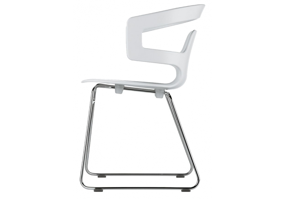 Der von Alfredo Häberli für Alias entworfene Segesta 500 ist ein Schlittenstuhl mit Armlehnen, einer Schale aus weißem Kunststoff und einer Basis aus lackiertem Stahl, die in verschiedenen Ausführungen erhältlich ist.
