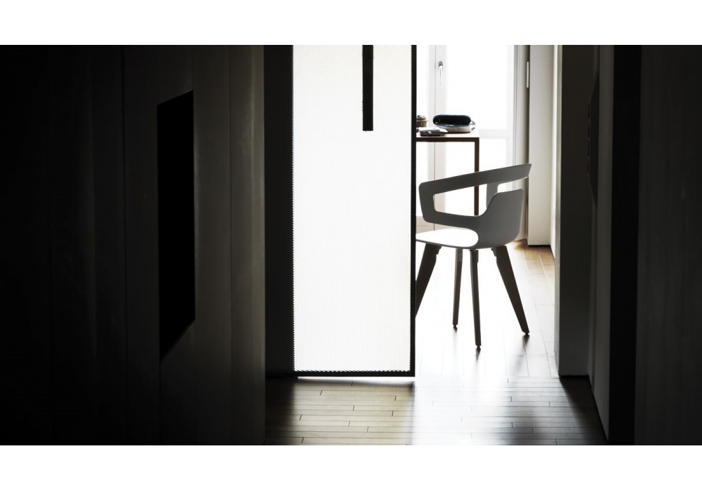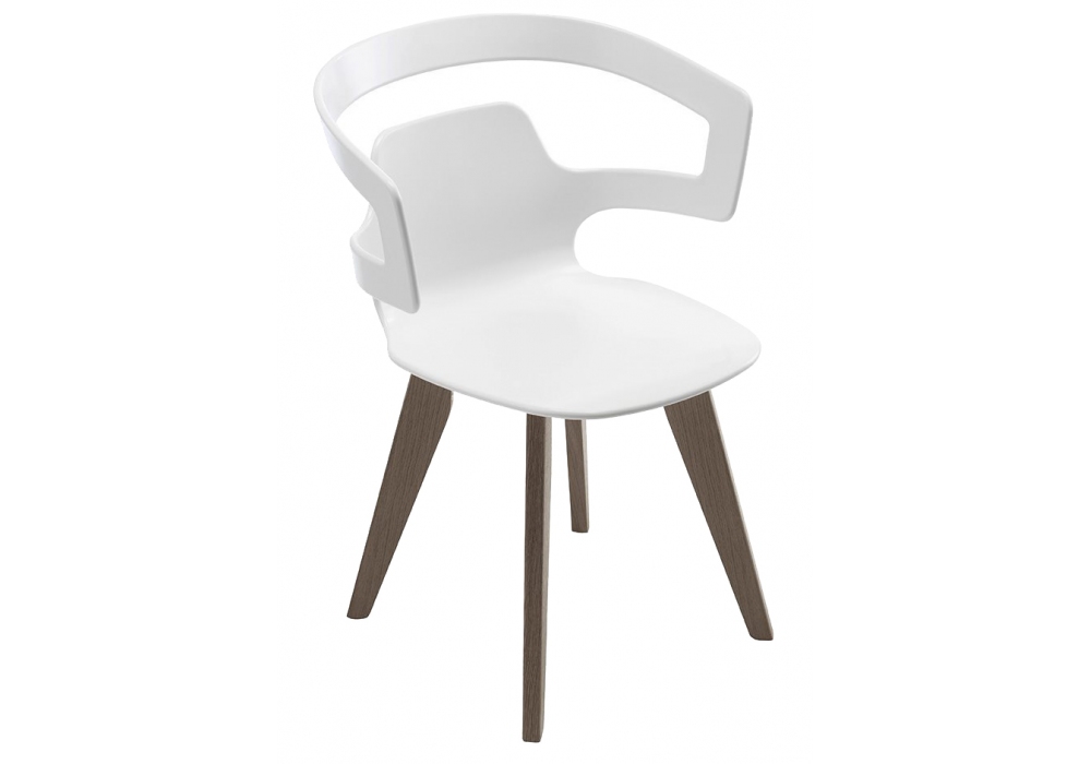 Der von Alfredo Häberli für Alias entworfene Segesta 558 ist ein Stuhl mit Armlehnen, einer Schale aus weißem Kunststoff und einer Basis aus Eichenholz oder offenporigem lackiertem Holz.