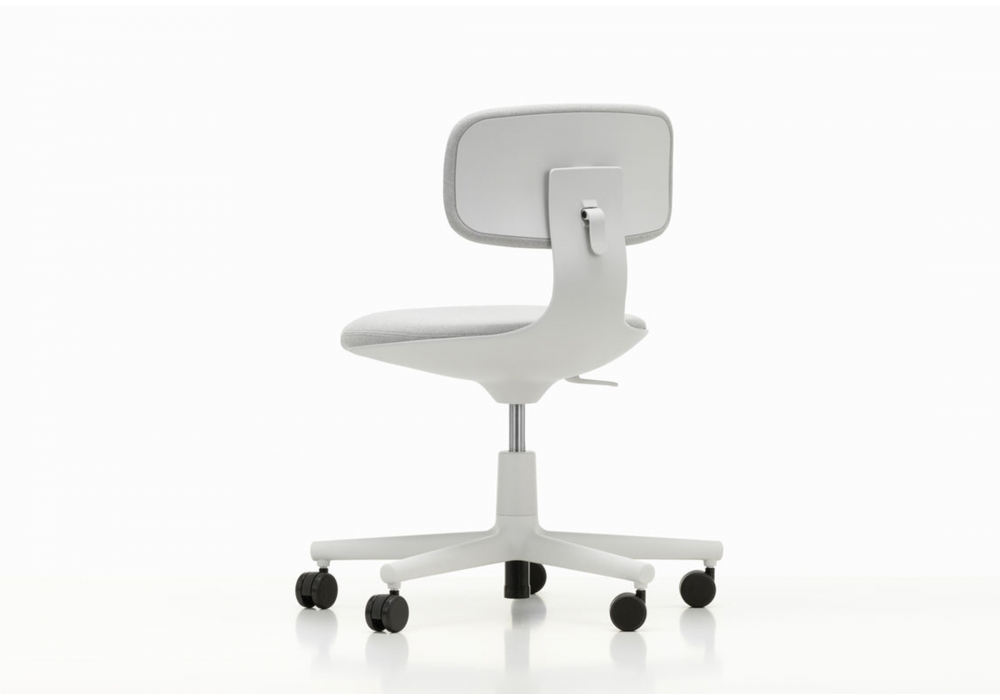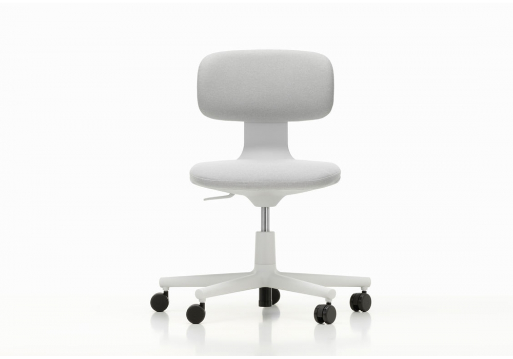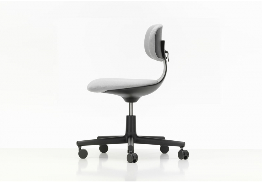 Rookie von Konstantin Grcic für Vitra entworfen, ist ein Drehstuhl mit Schale und Fünfsternfuß aus Polyamid in soft grey oder deep black Farben; Doppelrollen (Ø 60 mm) in basic dark. Polsterung aus Stoff oder Leder. Höhenverstellbar.
