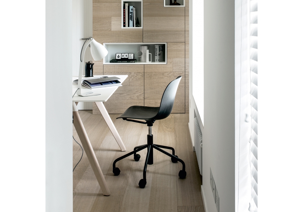 Troy 5 Star Wheels Beech von Marcel Wanders für Magis entworfen, ist ein Drehstuhl auf 5 Rädern mit Sitz aus Buchensperrholz, höhenverstellbar mit Gaskolben. Struktur aus verchromtem oder lackiertem Stahlrohr. Erhältlich in verschiedenen Ausführungen.