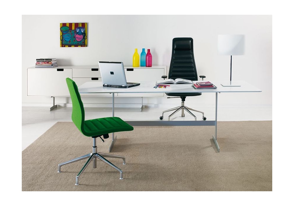 Lotus (Low) von Jasper Morrison für Cappellini entworfen, ist ein kippbarer Bürodrehstuhl mit variabler Höhe mit 5-Speichen-Untergestell aus Aluminiumdruckguss, Polsterung aus Polyurethanschaum unterschiedlicher Dichte und fester Bezug aus Stoff oder Leder. Erhältlich mit oder ohne Armlehnen.