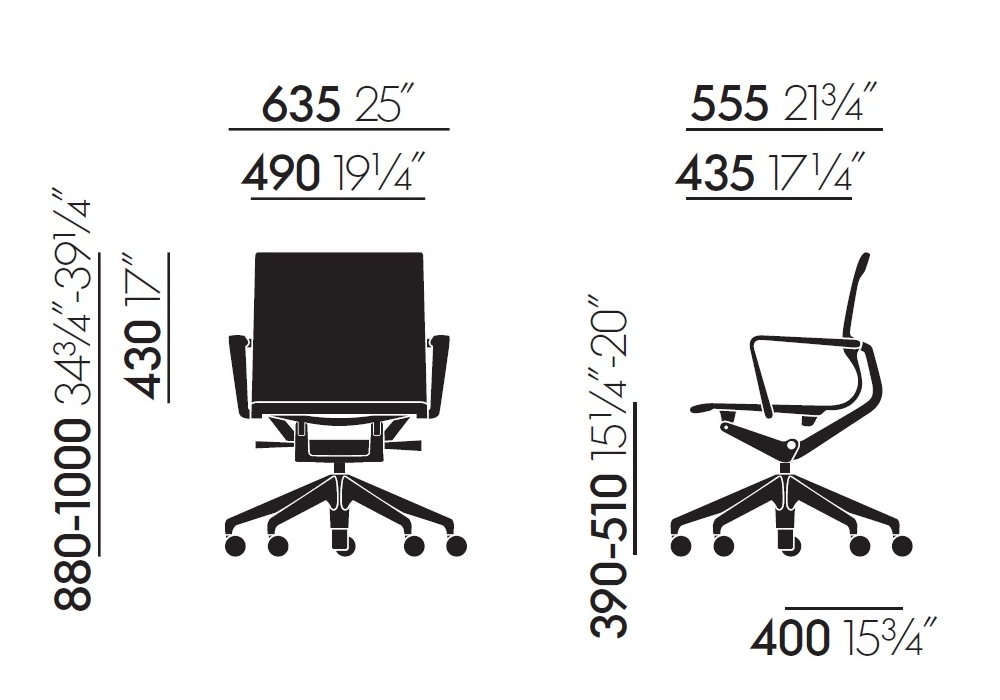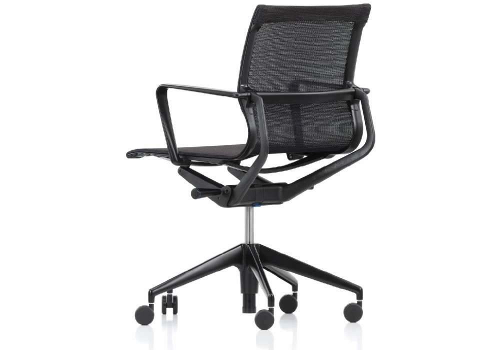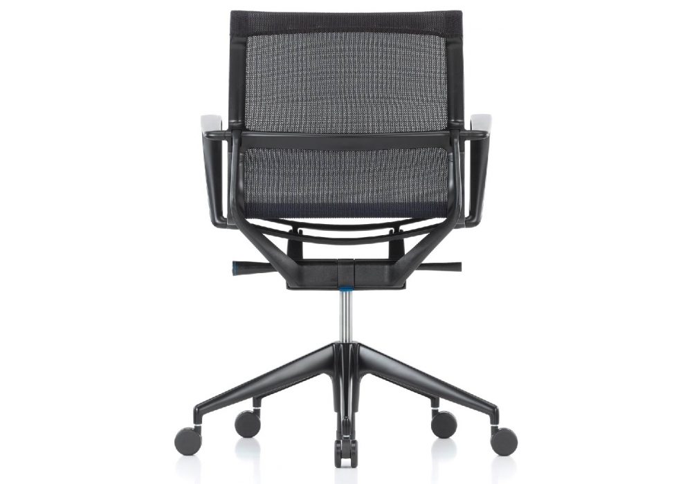Mechanik und Rückenbügel: aus pulverbeschichtetem Aluminium in tiefschwarz (RAL 9005) oder soft grey (RAL 7047). Mit synchronem Bewegungsablauf, individueller Feinjustierung der Rückenlehnen-Gegenkraft und Arretierung in aufrechter Position. Sitzhöhe über Gasfeder stufenlos verstellbar.