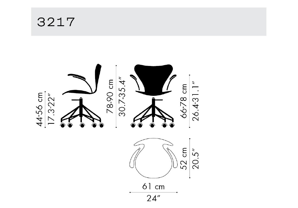 Series 7 von Arne Jacobsen für Fritz Hansen entworfen, ist ein Drehstuhl mit Armlehnen mit Schale aus furniertem Holz oder aus lackierter oder gefärbter Esche und 5-Stern-Fußkreuz mit Rollen aus verchromtem oder pulverbeschichtetem Stahlrohr. Verfügbar in mehreren Ausführungen.