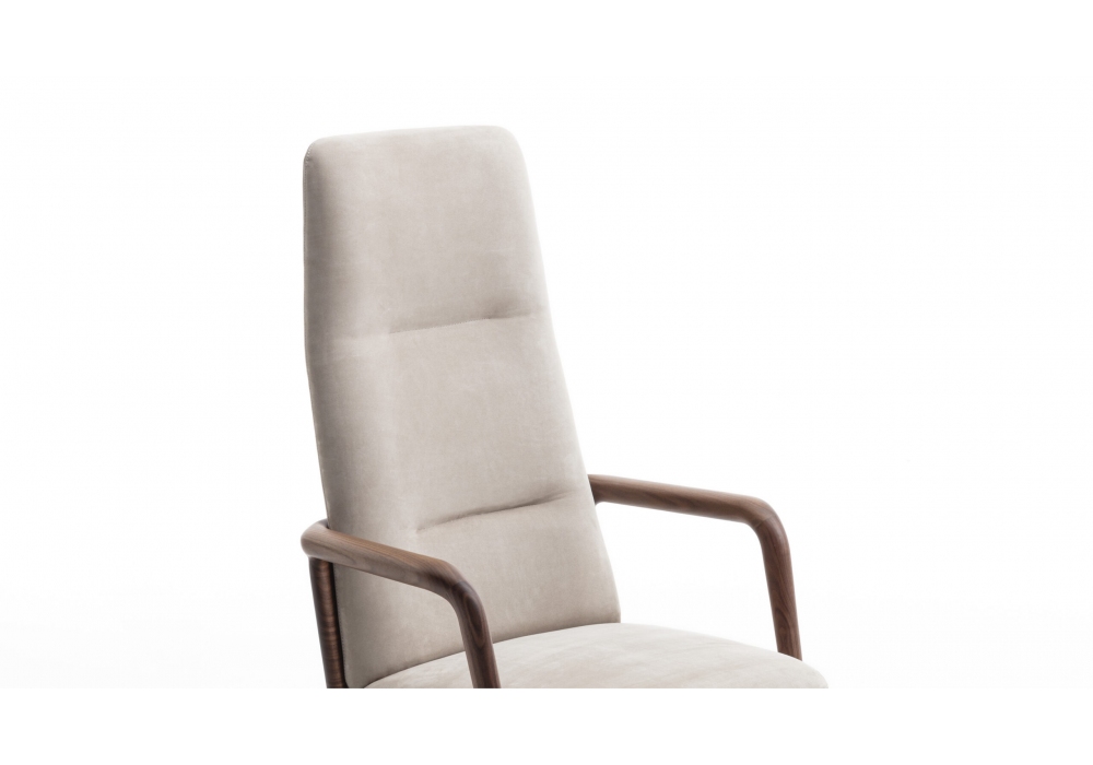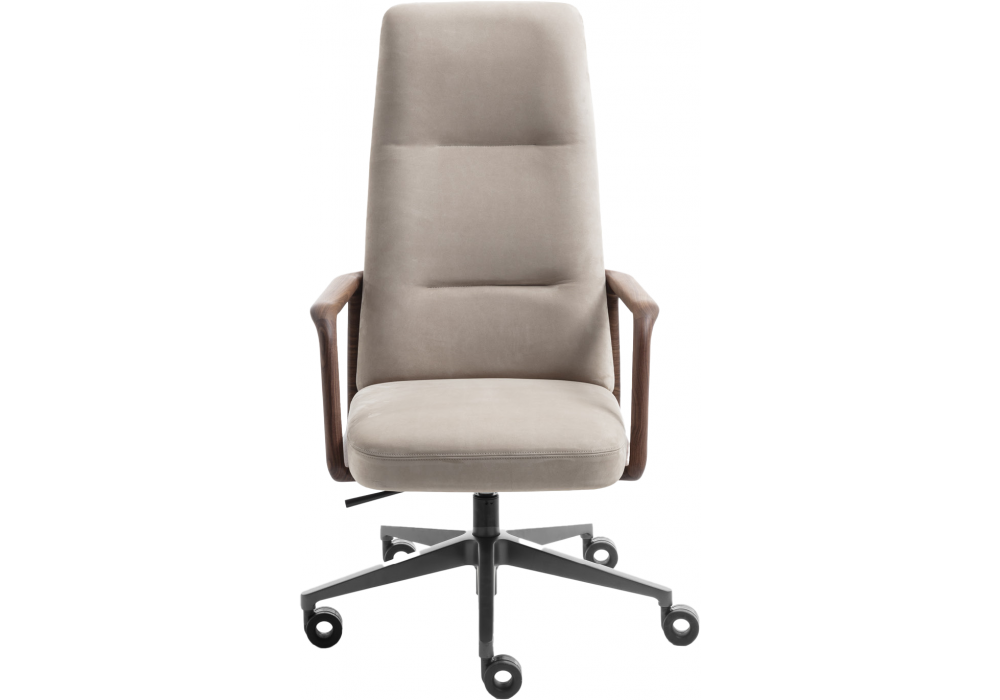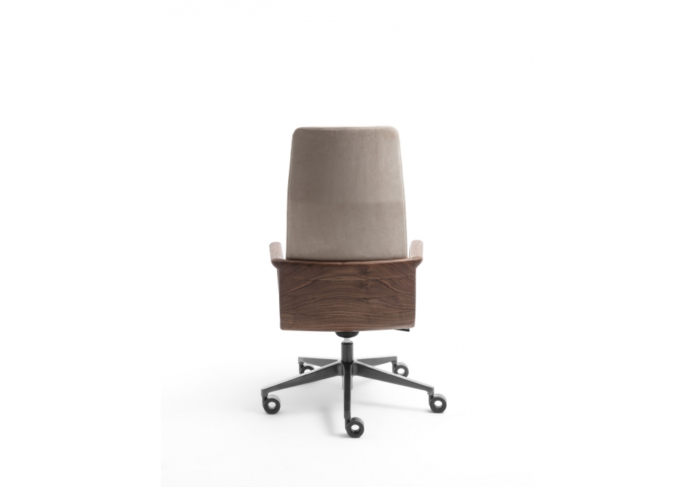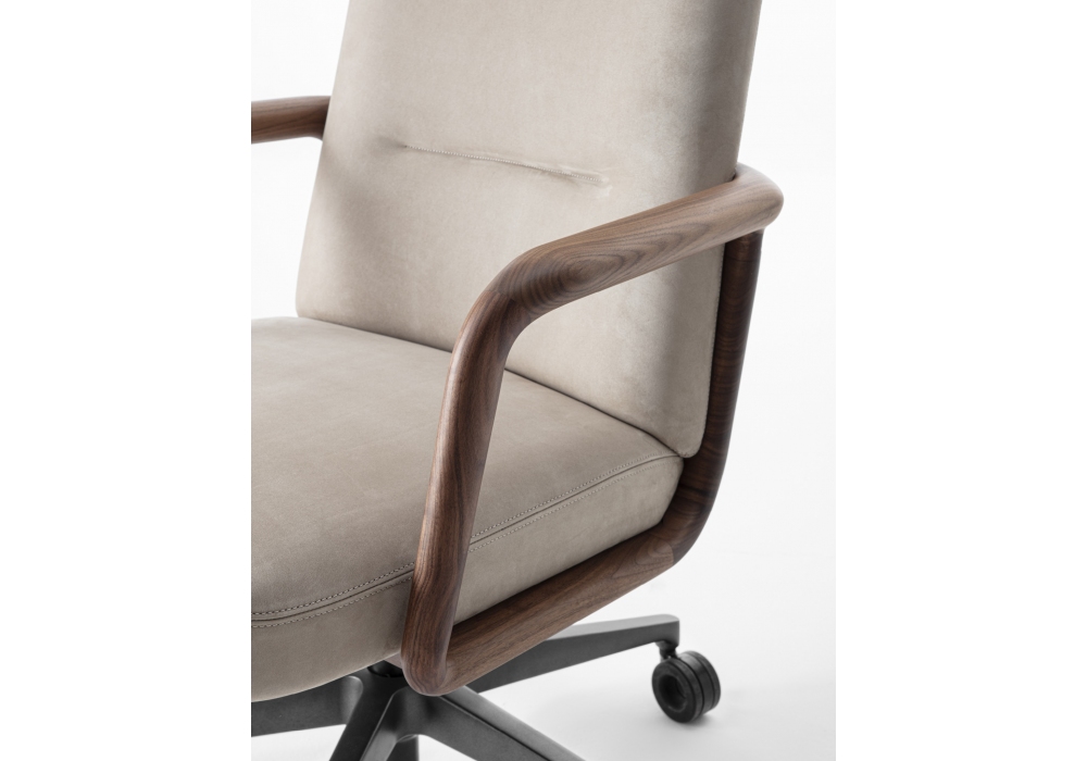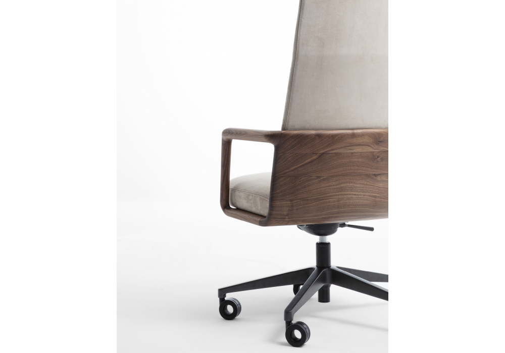 Cuna von E. Gallina für Porada entworfen, ist ein Chefsessel mit synchronisierter Bewegung und einem 5-Speichen-Drehgestell aus Metall auf Rädern. Innere Struktur von Rückenlehne und Sitzfläche aus Sperrholz. Äußere Sitzschale aus massivem Canaletta-Nussbaum mit integrierten Armlehnen. Sitzhöhe und Rückenlehnenwiderstand sind einstellbar.