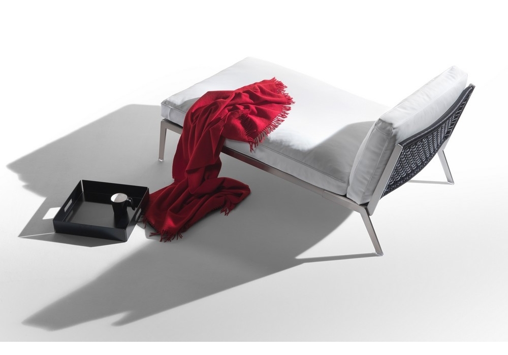 Happy is a chaiselongue designed by Antonio CItterio for Flexform. Frame in metal with leather with seat mattress in dacron. Backrest metal frame and woven leather cord available in different colours. Backrest cushion down-filled. Throw pillows down-filled are optional.