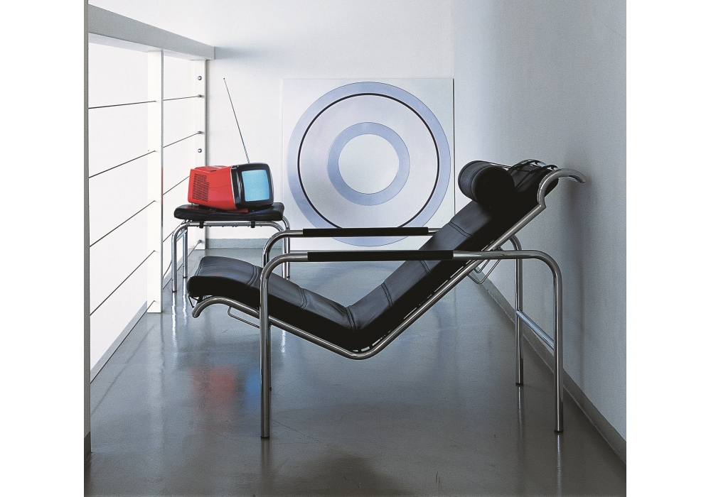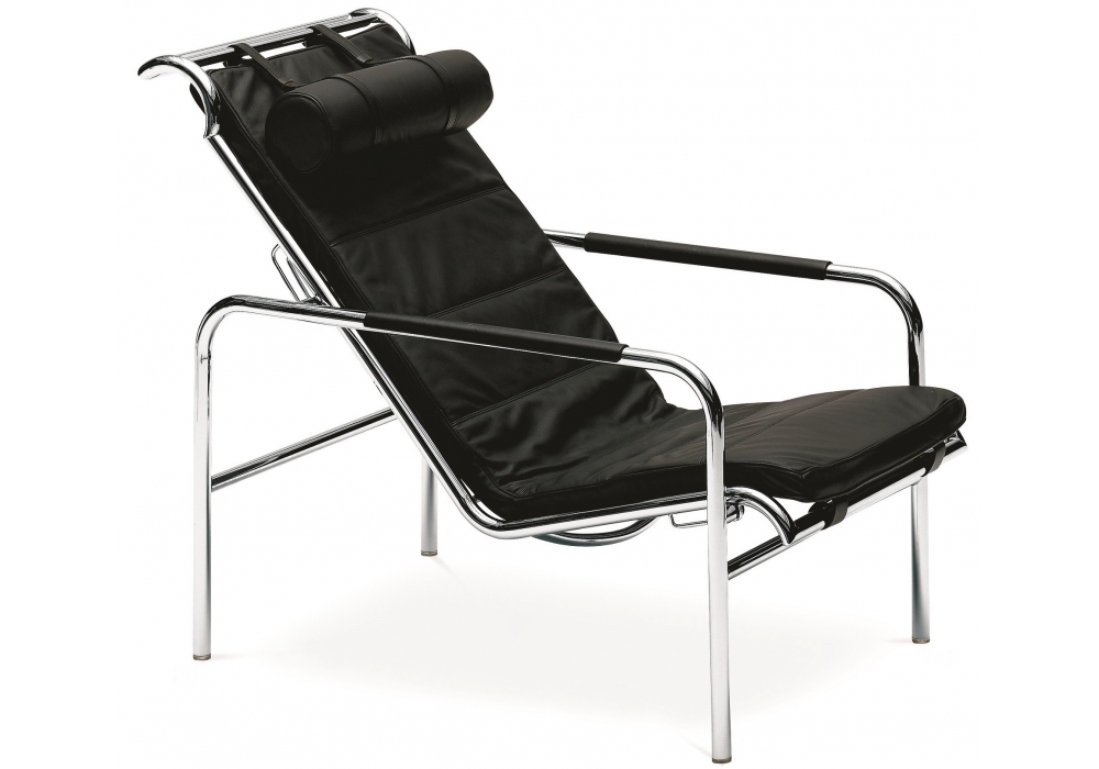 920 Genni von Gabriele Mucchii für Zanotta entworfen, ist eine Chaise Longue mit Gestell aus verchromtem Stahl, natur oder schwarz nickel-satiniert oder schwarz lackiert. Auf Stahlspiralen gefedert, Sitz in zwei Positionen verstellbar. Polsterung aus Polyurethan und Bezug der Kissen und Armlehnen aus Leder. Verfügbar mit oder ohne Sitzpuff.