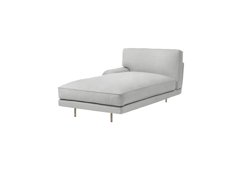 Flaneur von GamFratesi für Gubi entworfen, ist eine Chaiselongue verfügbar mit Stoff- oder Lederbezug und schwarz matt oder antik Messing lackiertem Gestell.