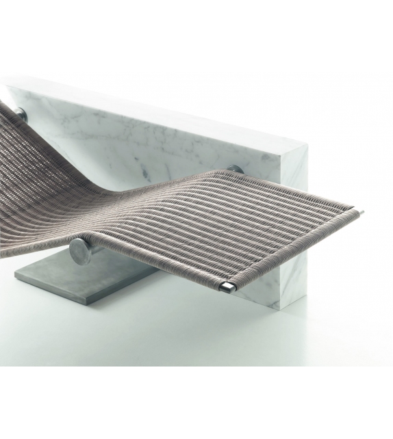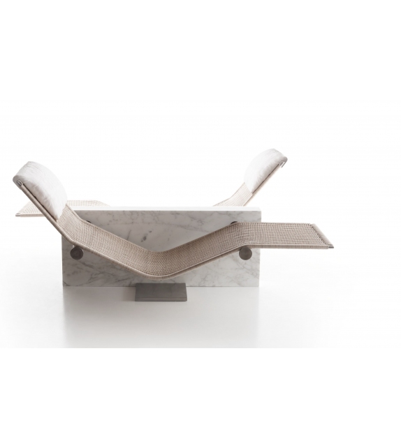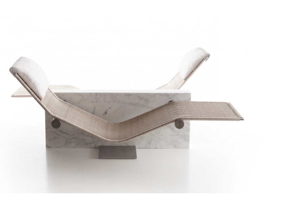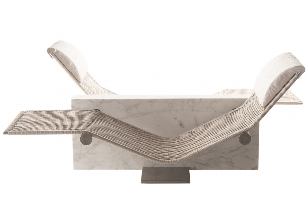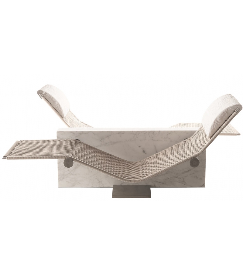 Vis à Vis, von Enzo Berti für Kreoo entworfen, ist eine Chaiselongue mit Marmorstruktur in verschiedenen Ausführungen, Sitz aus Naturgeflecht mit Kopfstützenkissen aus Naturleinen.