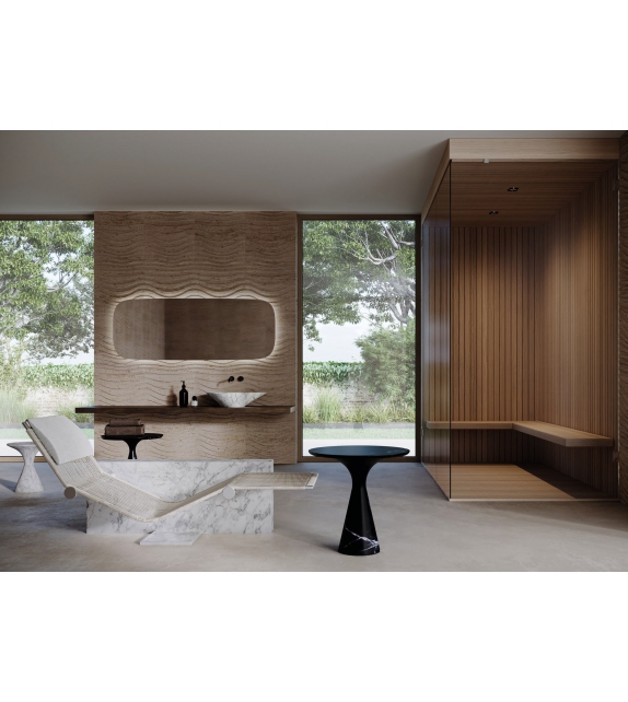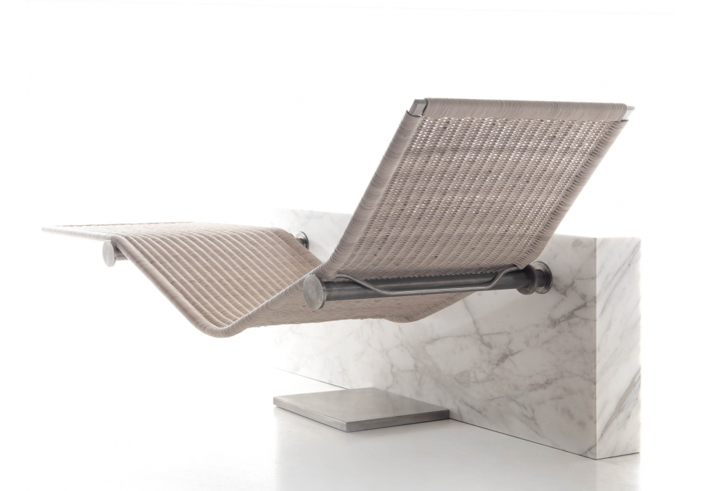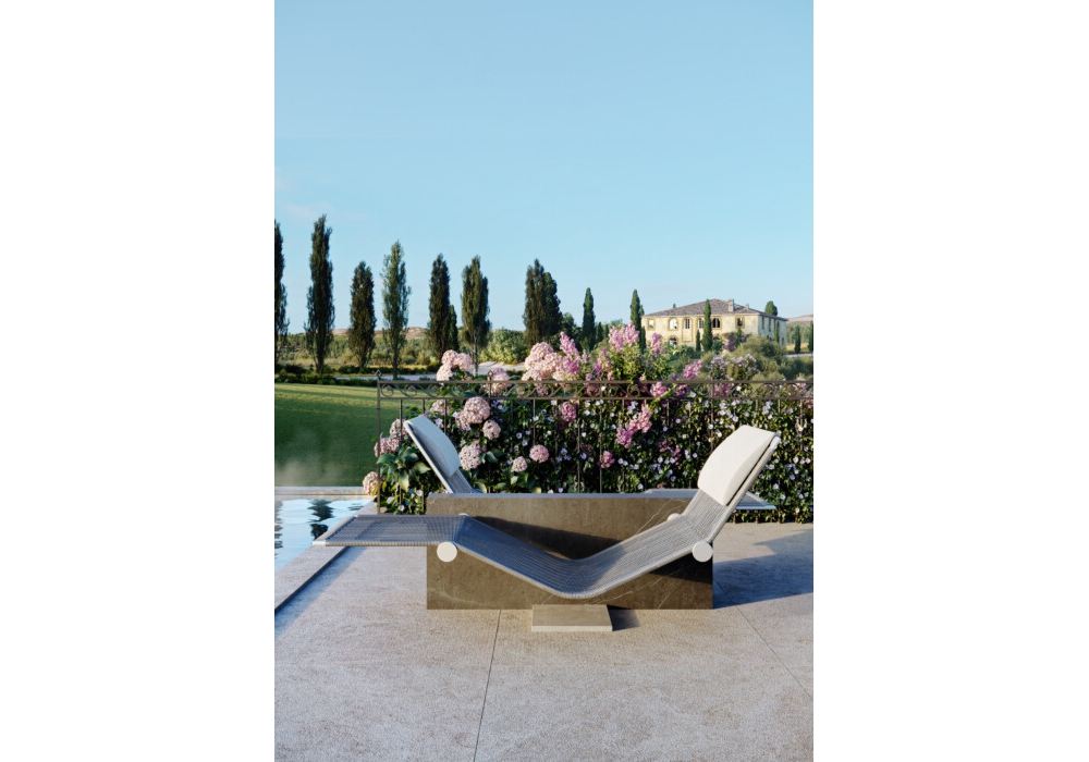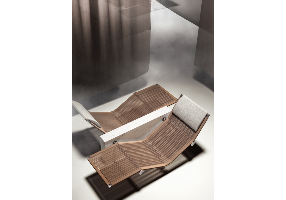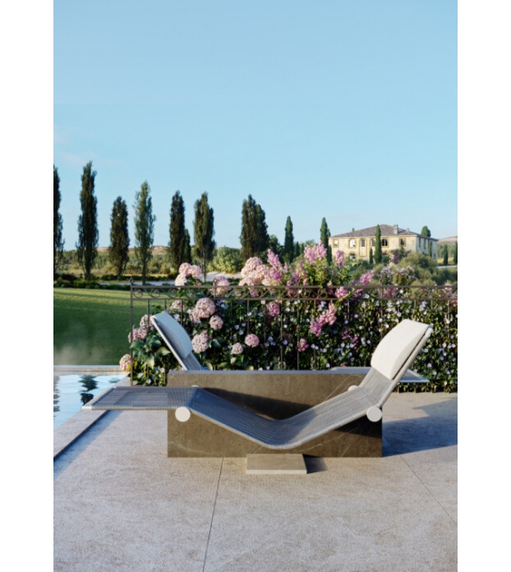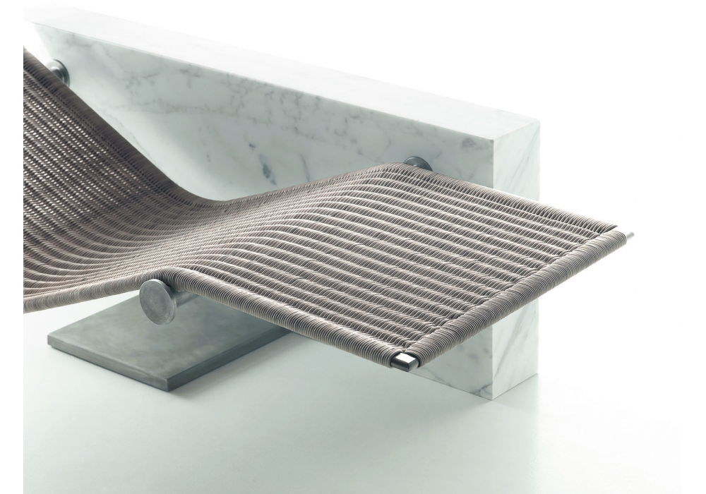 Vis à Vis, von Enzo Berti für Kreoo entworfen, ist eine Chaiselongue mit Marmorstruktur in verschiedenen Ausführungen, Sitz aus Naturgeflecht mit Kopfstützenkissen aus Naturleinen.