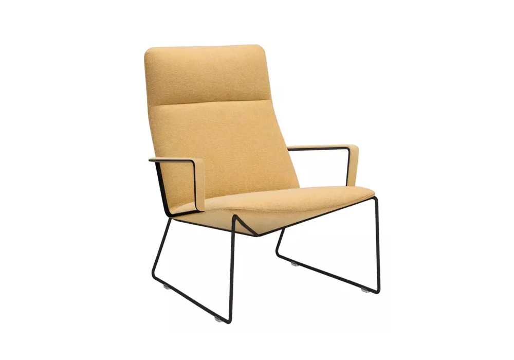 Capri Lounge von Piergiorgio Cazzaniga für Andreu World entworfen, ist ein Loungesessel mit Kufengestell aus Stahl in glänzendem Chrom, Schwarz oder Weiß. Polsterung in mehreren Ledern, Kunstledern oder Stoffen.